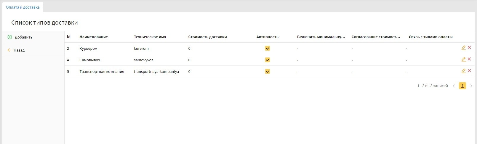 По умолчанию доступно 3 типа доставки - Курьером, Самовывоз и Транспортная компания.