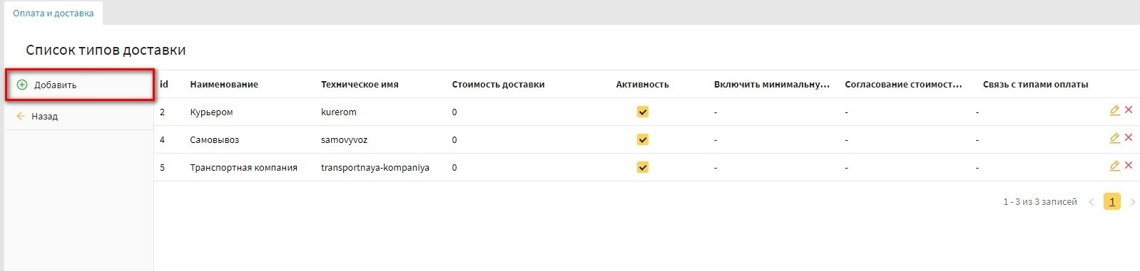 кнопка "Добавить" - открывает интерфейс добавления типа доставки.