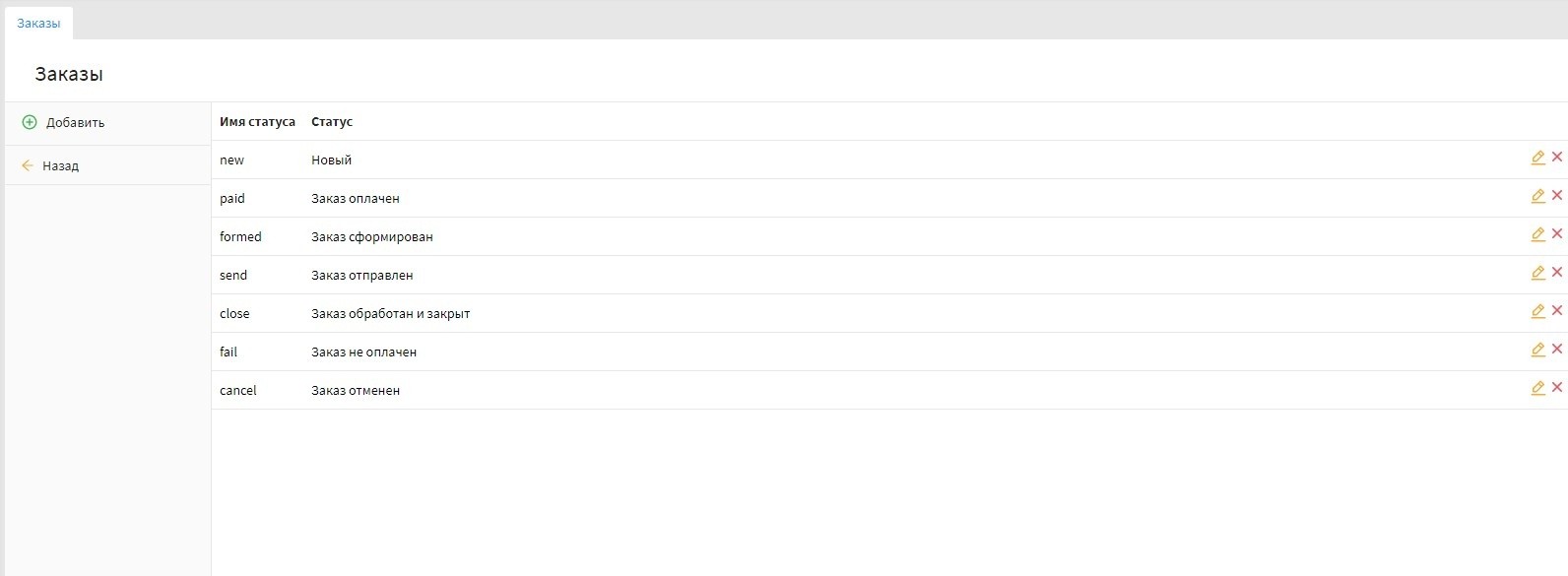 Функционал предназначен для работы со статусами заказа. Для перехода в интерфейс необходимо в блоке "Навигация" выбрать пункт "Панель управления" - панель "Заказы" и нажать на кнопку "Статусы". Скриншот.