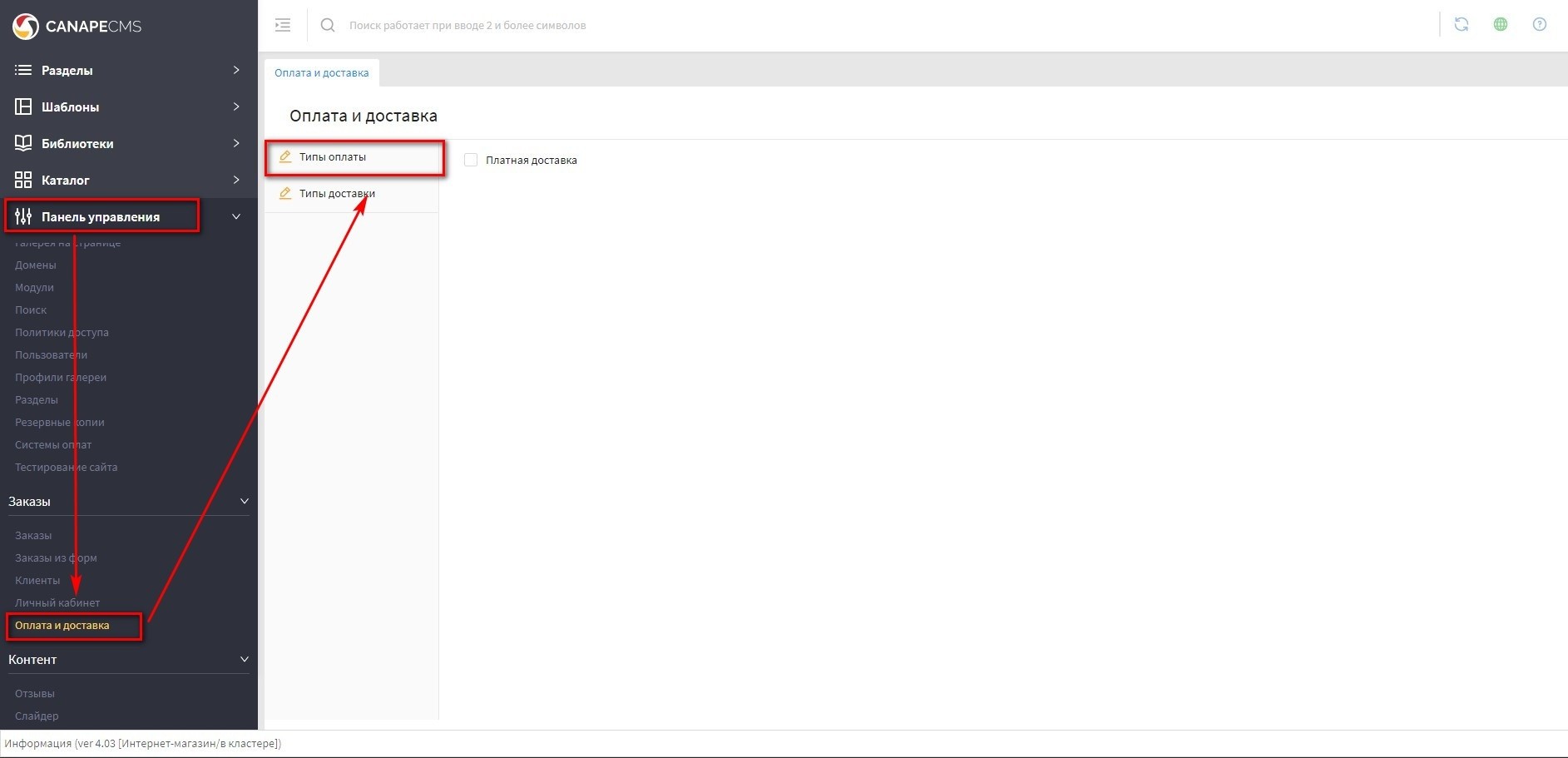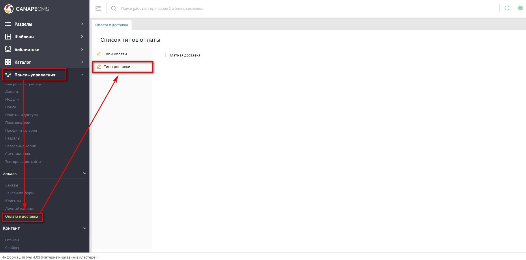 Внимание! С 34 версии Canape CMS функционал перенесен в модуль "Оплата и доставка".
