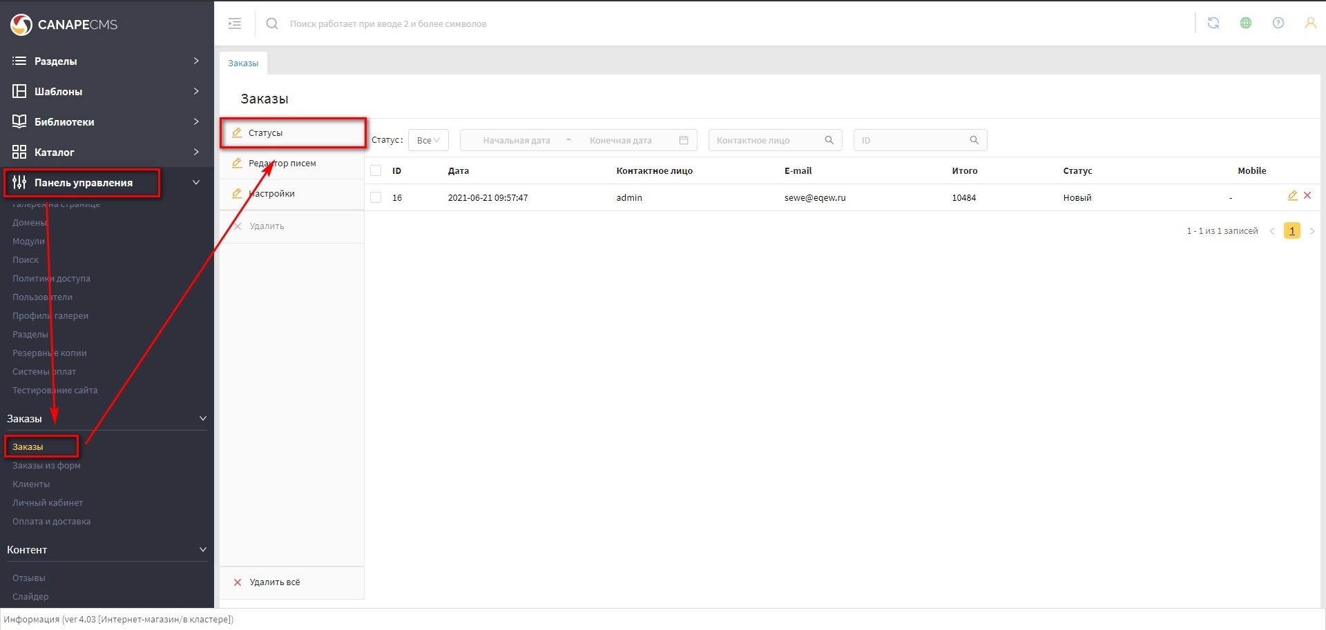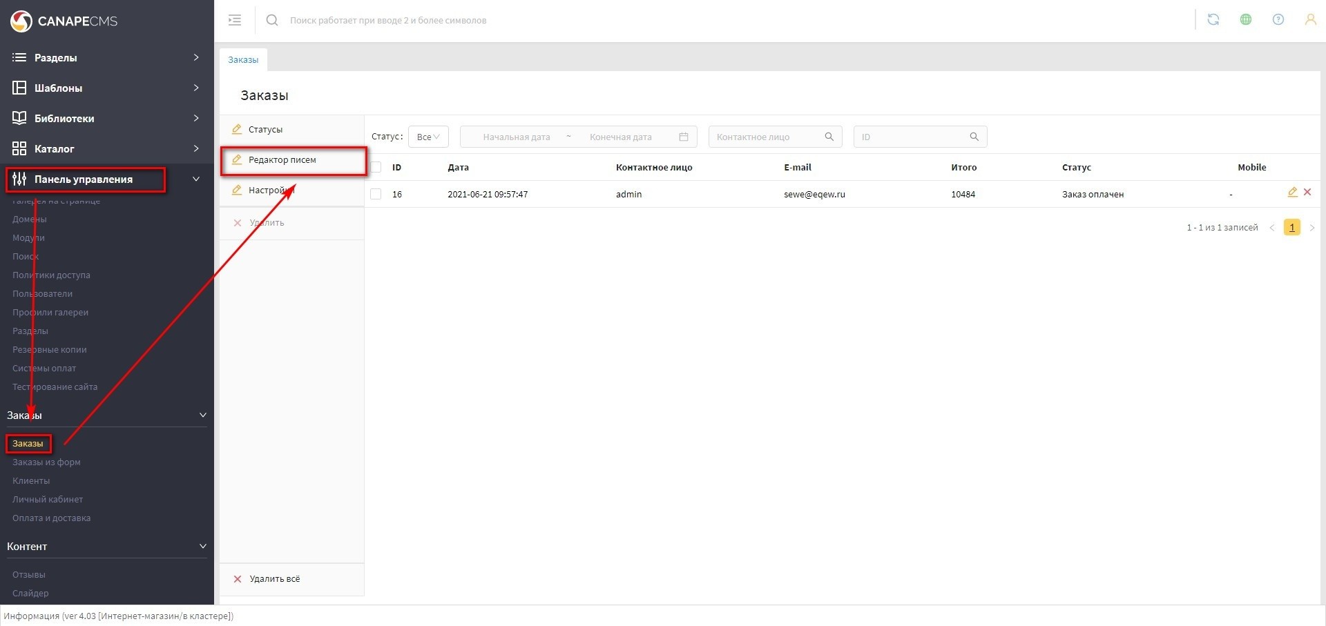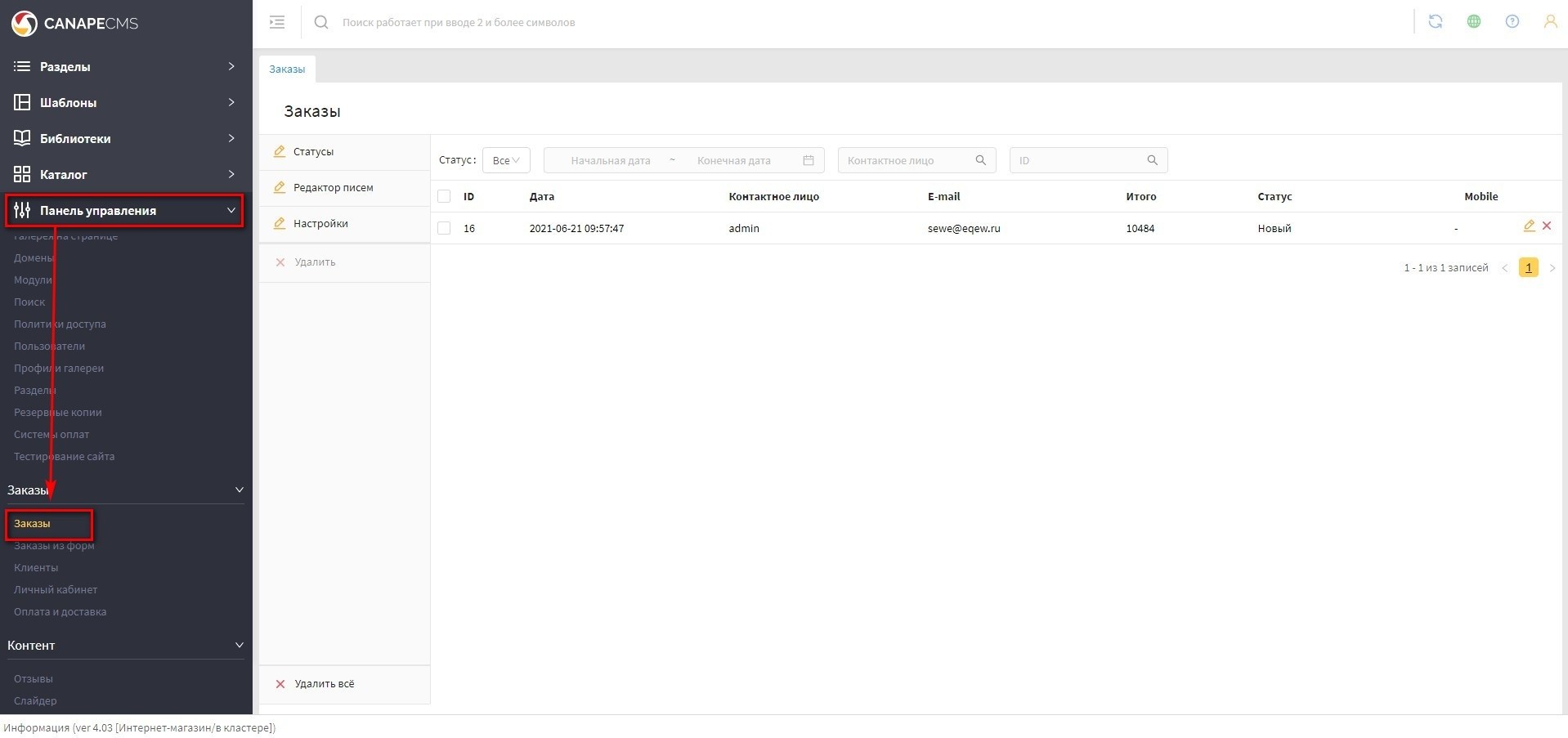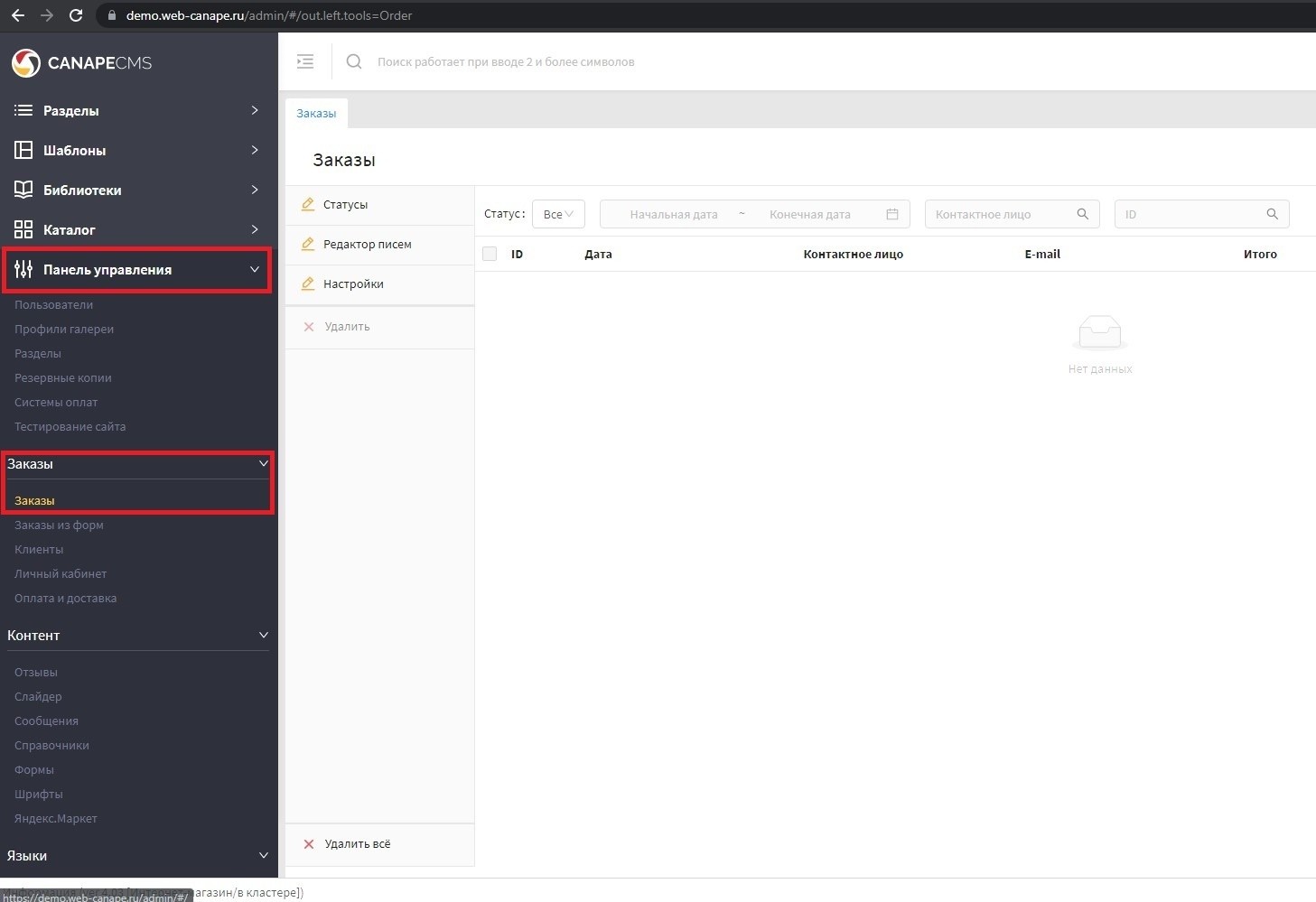В 19 версии Canape CMS добавлен модуль "Заказы". Модуль является полноценной корзиной и позволяет просматривать уже оформленные заказы в CMS. Он присутствует на сайте типа "Интернет-магазин."