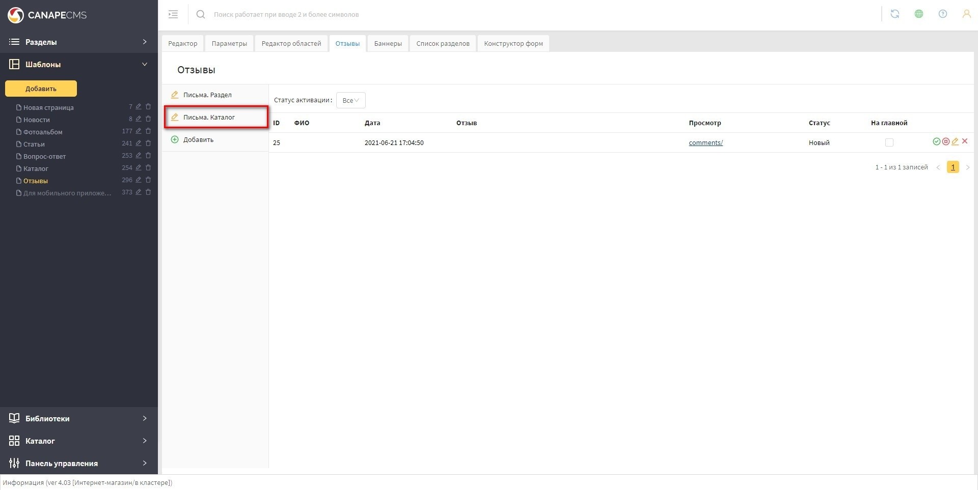 Для перехода в интерфейс необходимо в блоке "Навигация" выбрать пункт "Панель управления" - панель "Отзывы" и нажать на кнопку "Письма.каталог". Скриншот.