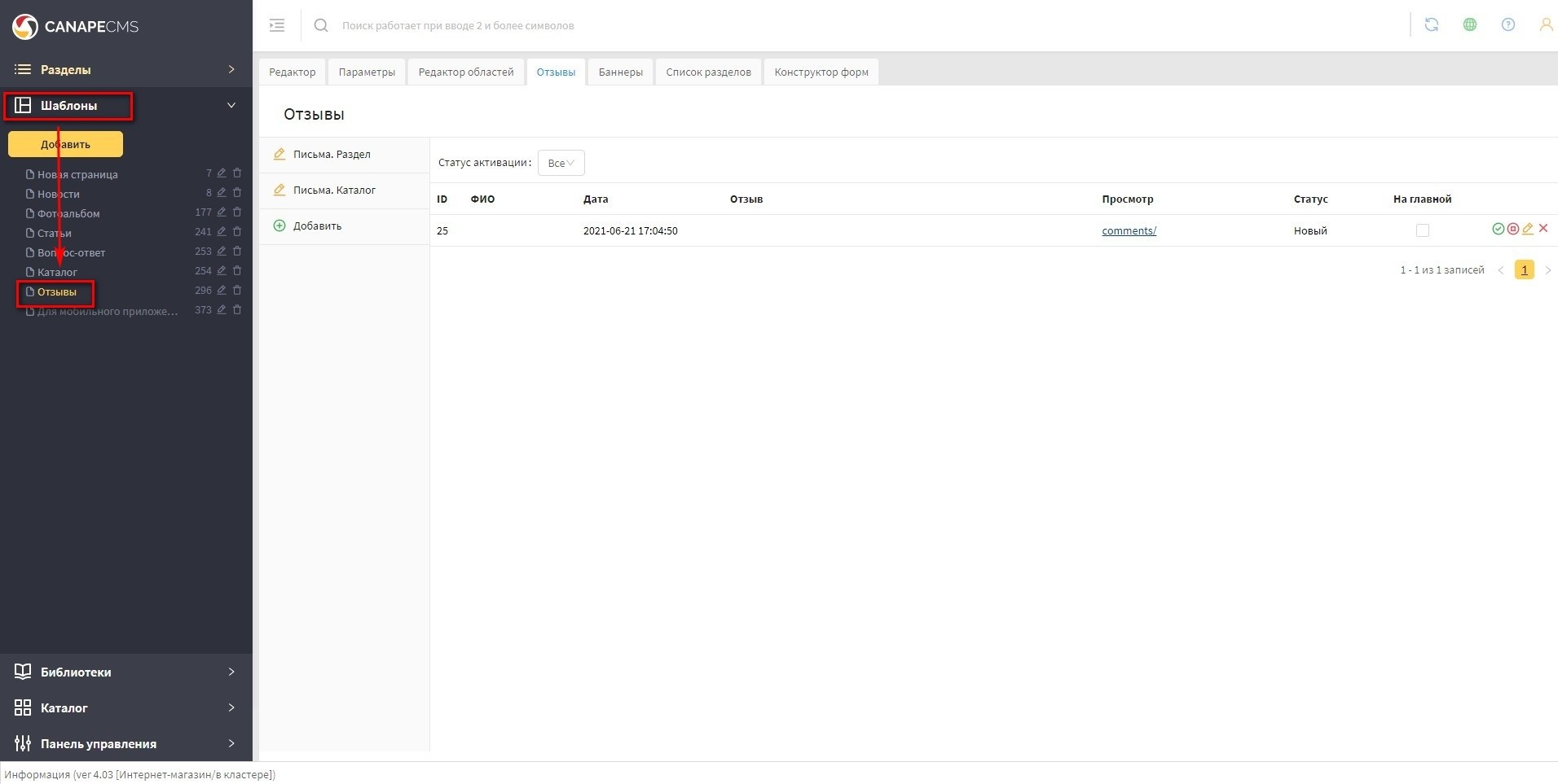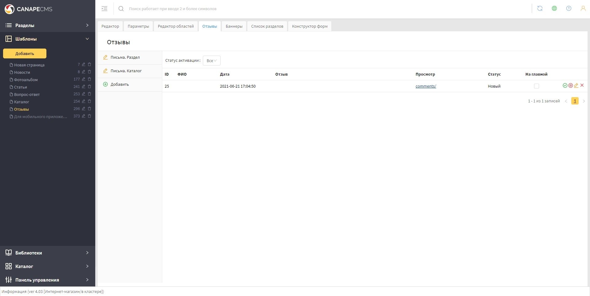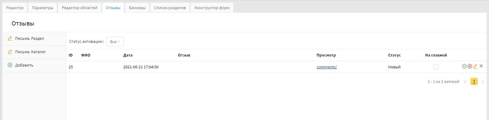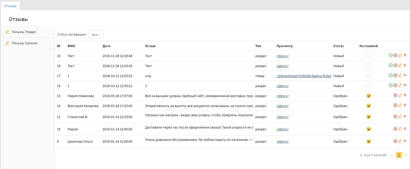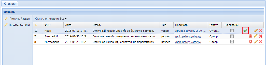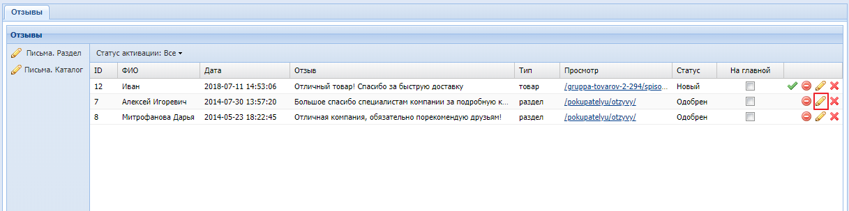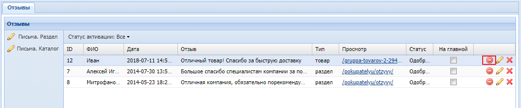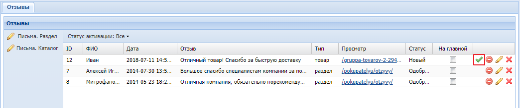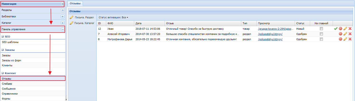 В панели "Отзывы" предусмотрен механизм, который позволяет управлять статусами отзывов, изменять их.