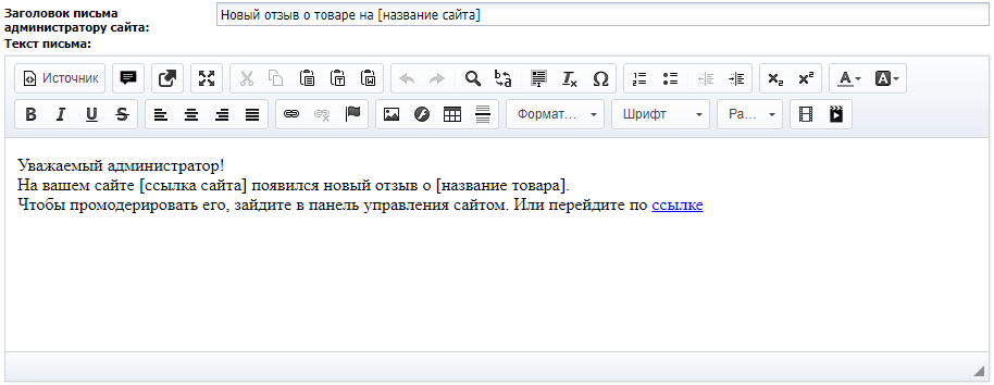 С помощью данного функционала можно настроить сообщения, которые приходят администратору и пользователю сайта при оставлении отзыва в товаре.