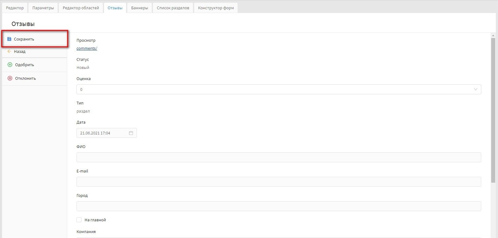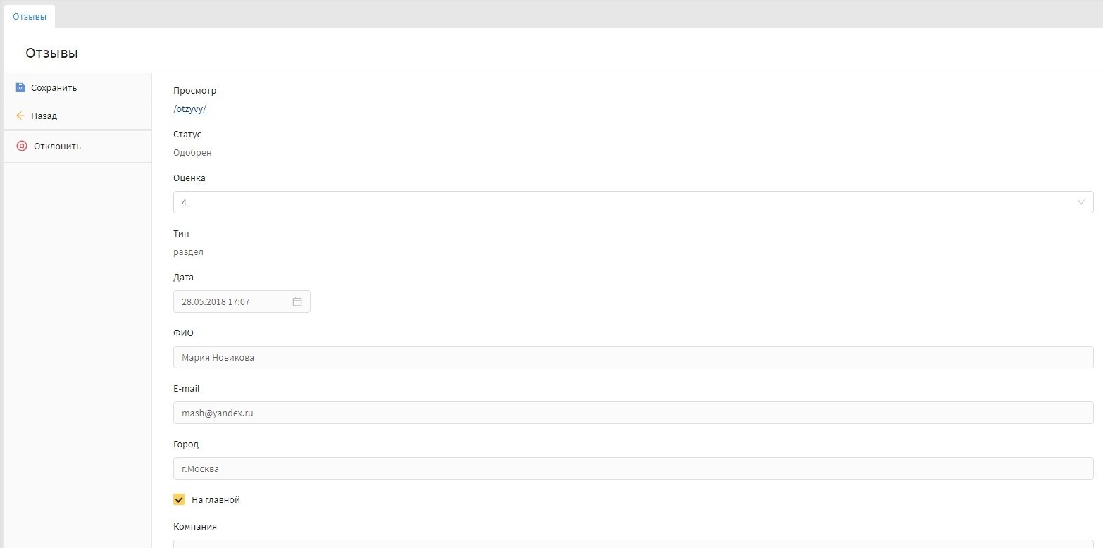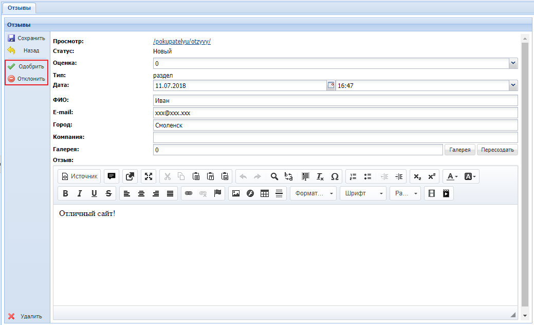 Внимание! Если Вы ставите для отзыва статус "Одобрен", то он автоматически выводится на сайте. Отзывы со статусом "Новый" и "Отклонен" на сайте не выводятся.