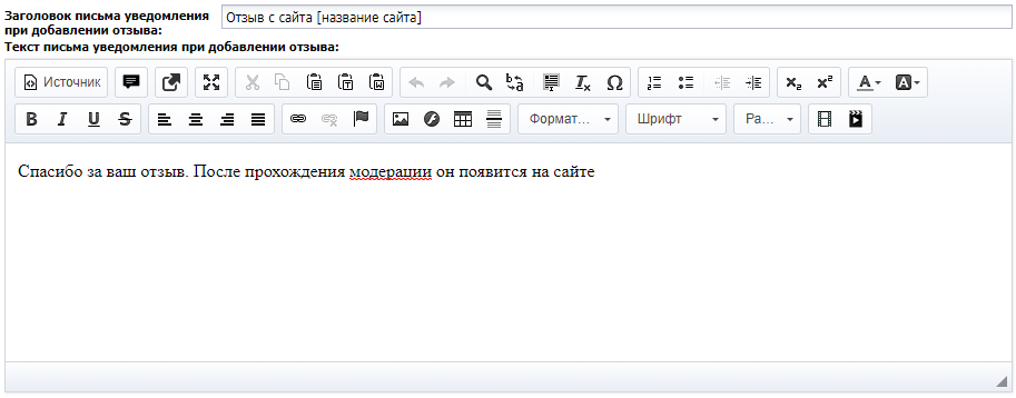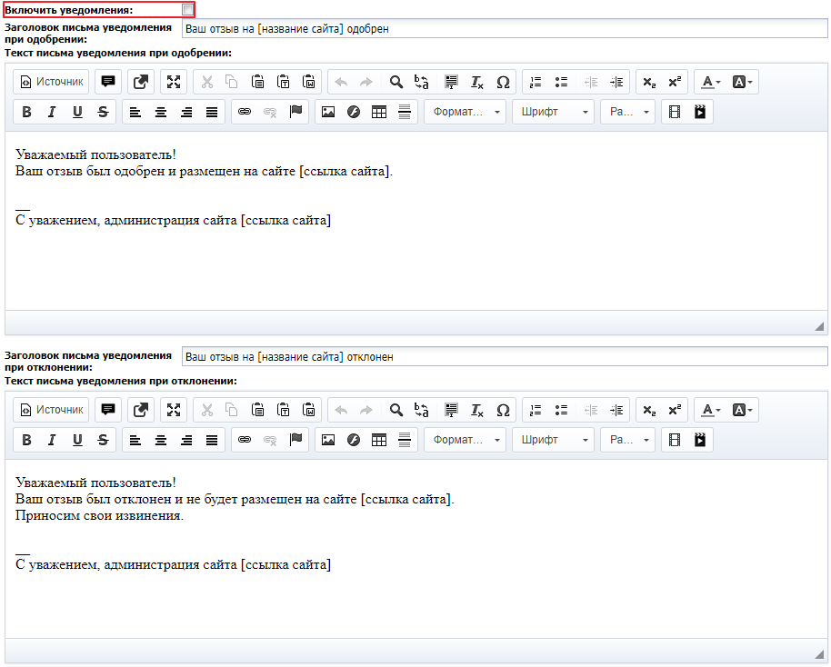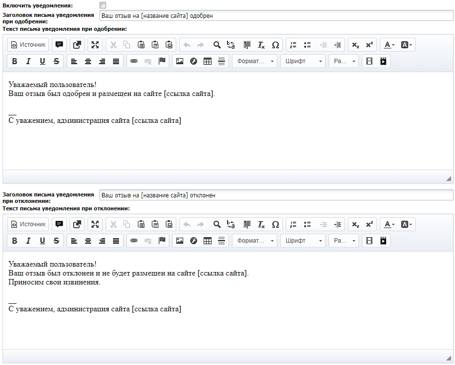 С помощью данного функционала можно настроить сообщения, которые приходят администратору и пользователю сайта при оставлении отзыва в разделе.