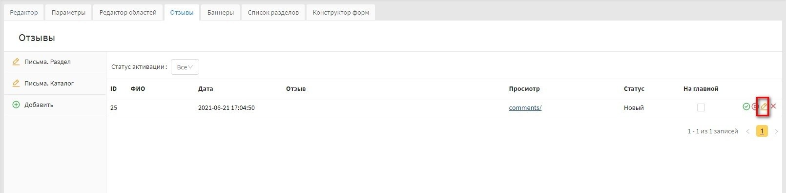в центральном блоке откроется вкладка "Отзывы". Выбираем отзыв, у которого нужно изменить статус и нажимаем на иконку редактирования, либо дважды левой кнопкой мыши. Скриншот