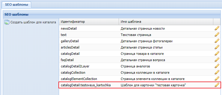 В списке шаблонов появится новый шаблон с идентификатором catalogDetail:название_карточки_транслитом и названием "Шаблон для карточки "название карточки"". Скриншот