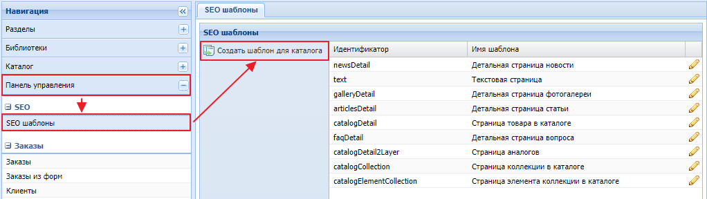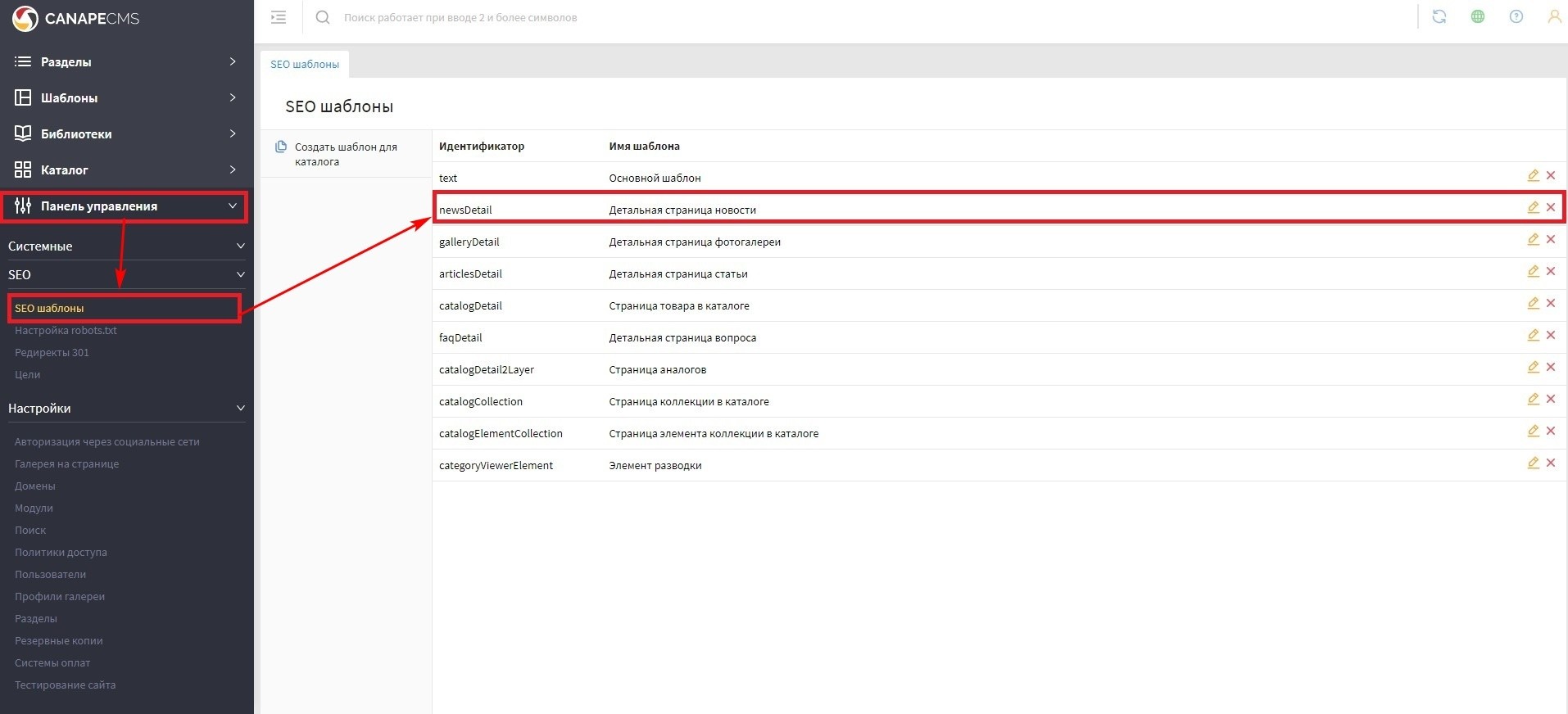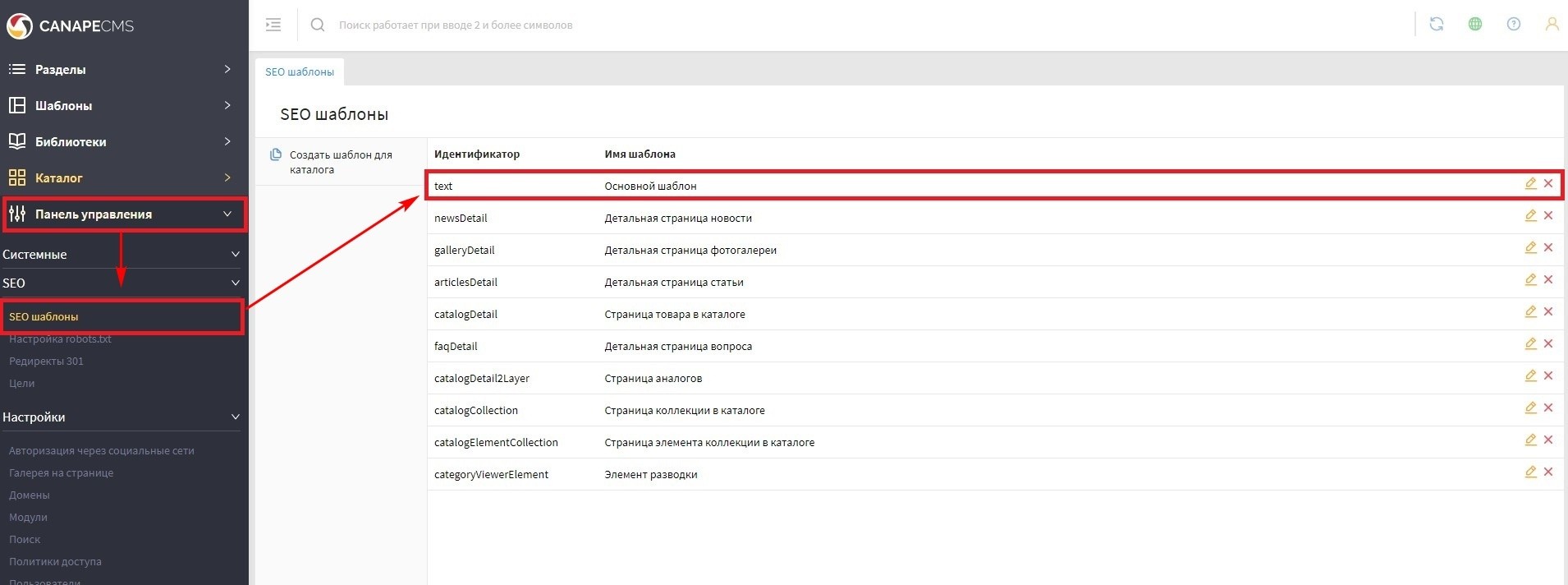 Для открытия интерфейса редактирования SEO шаблона необходимо:
