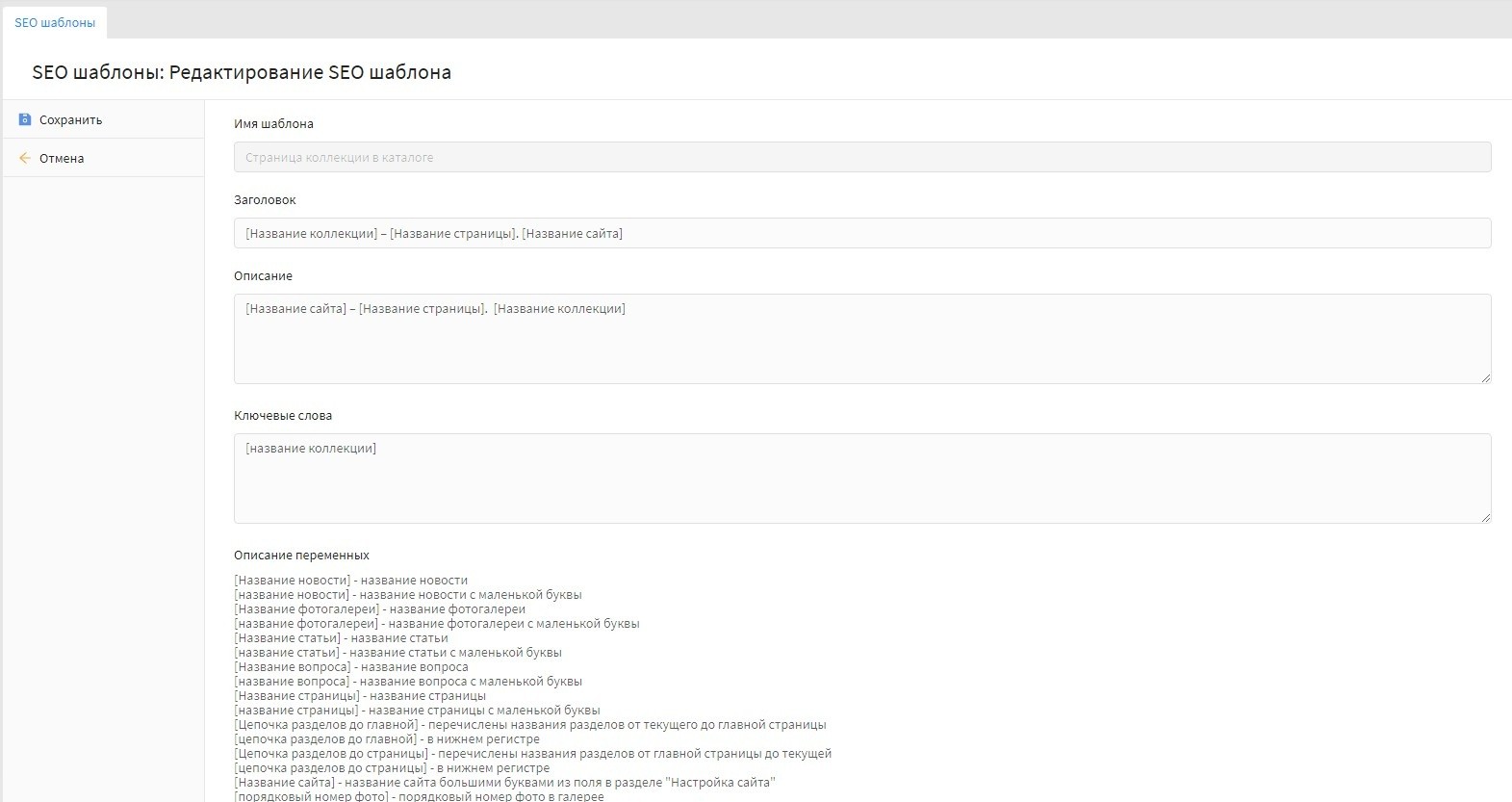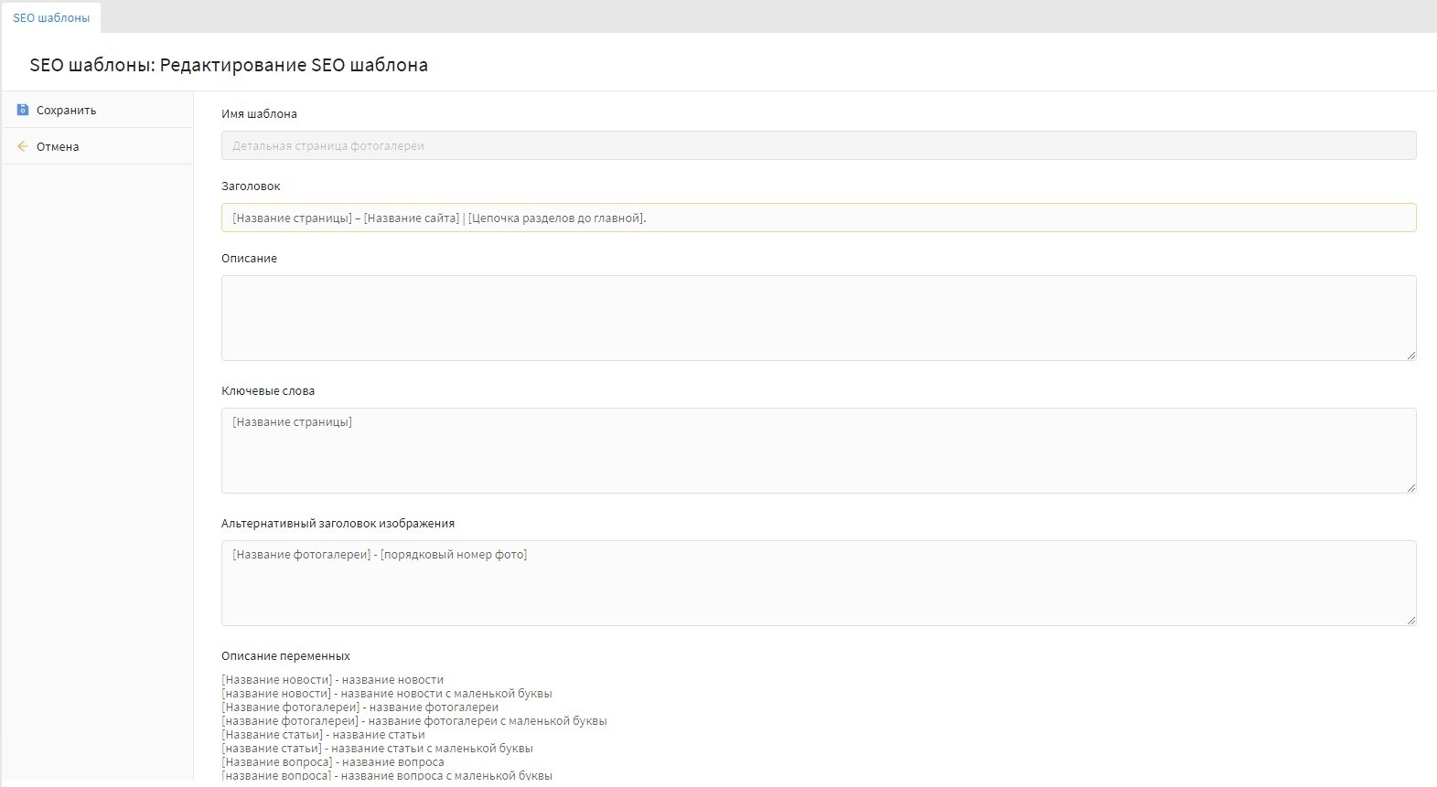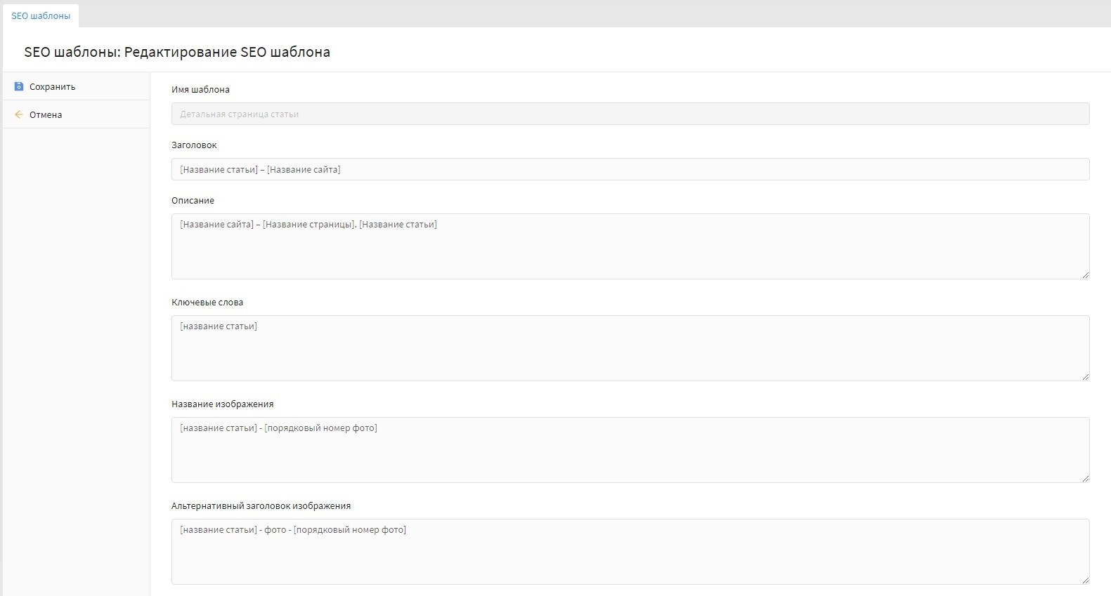 SEO шаблоны предназначены для настройки автоматического формирования метатегов на сайте. Под каждый тип раздела есть свой шаблон, редактируя который, можно индивидуально настроить метатеги.