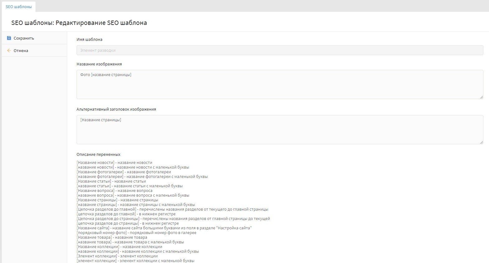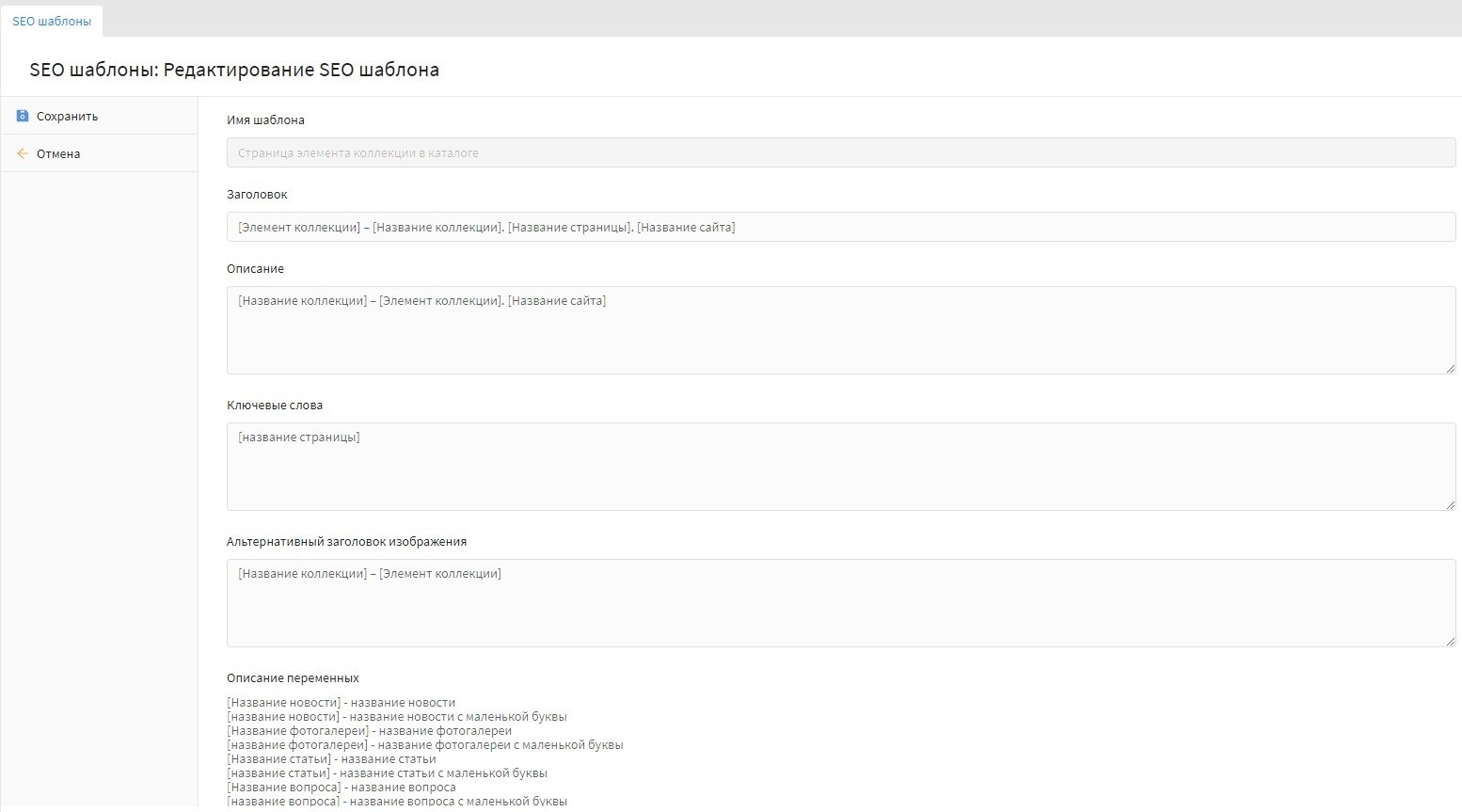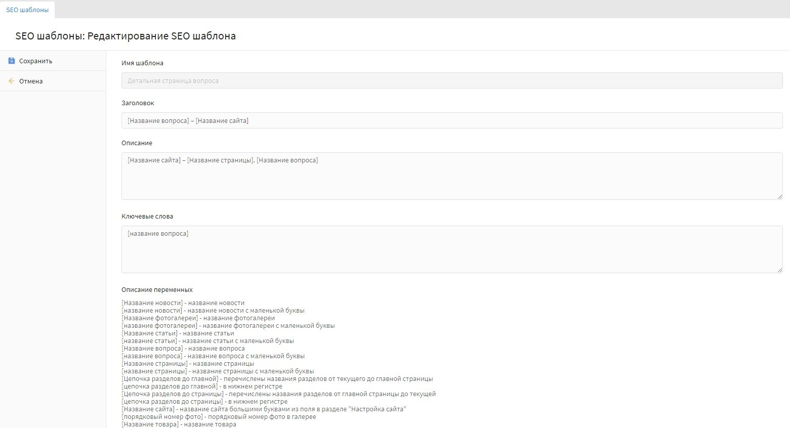 SEO шаблоны предназначены для настройки автоматического формирования метатегов на сайте. Под каждый тип раздела есть свой шаблон, редактируя который, можно индивидуально настроить метатеги.