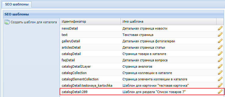 В списке шаблонов появится новый шаблон с идентификатором catalogDetail:id раздела и названием "Шаблон для раздела "название раздела"".