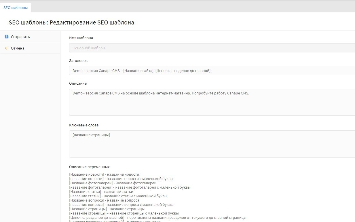 SEO шаблон предназначен для настройки блока "SEO данные" раздела, созданного по шаблону "Новая страница". Шаблон в 33 версии Canape CMS переименован из "Текстовая страница" в "Основной шаблон".
