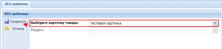 в открывшемся интерфейсе, в поле "Выберите карточку товара" выбираем нужный шаблон карточки и нажимаем кнопку "Сохранить". Скриншот.