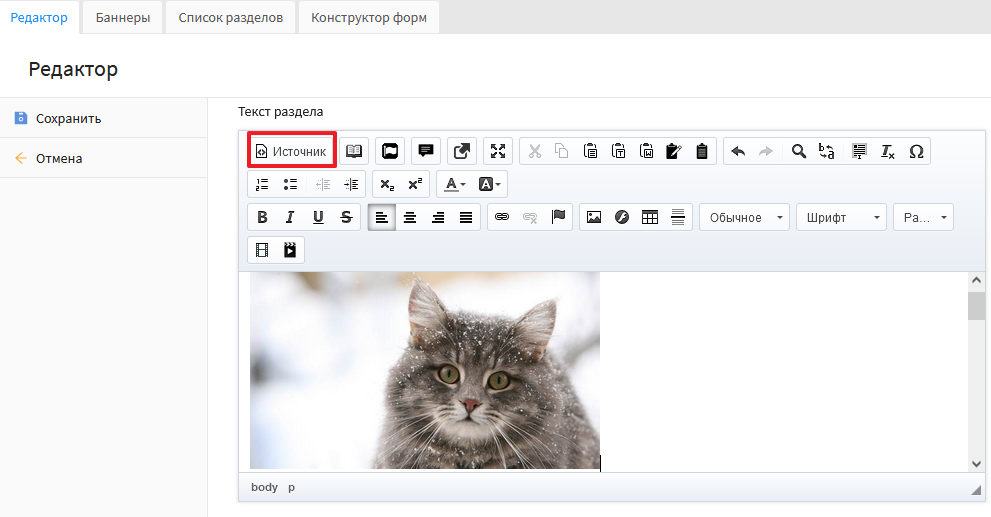 нажмите на кнопку "Источник " и вставьте кусок кода. Скриншот
