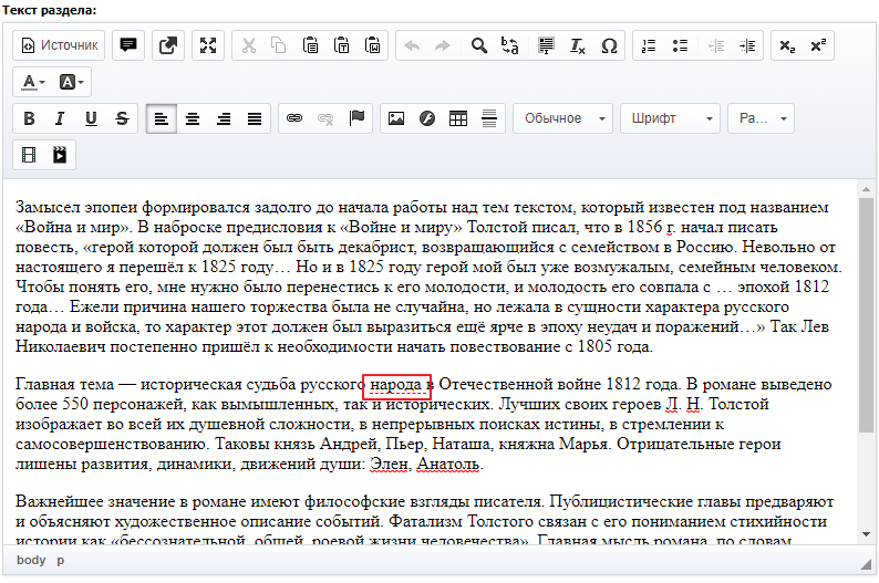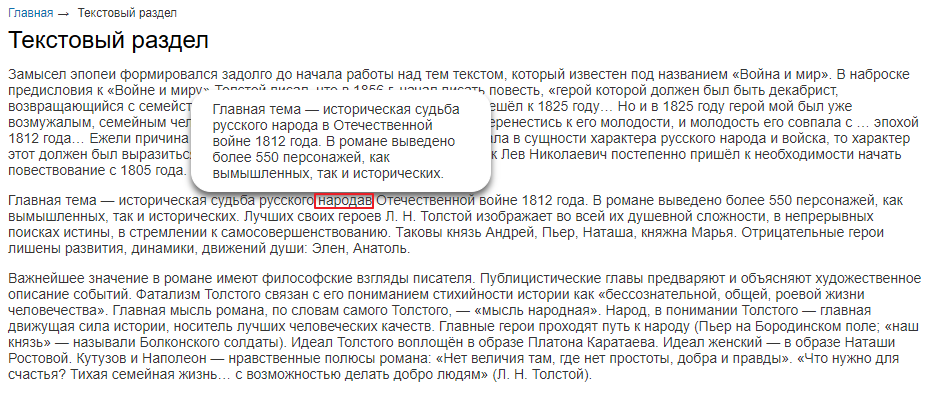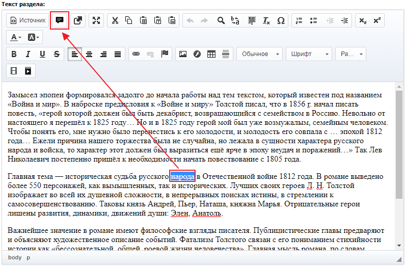 в поле "Текст раздела " выберите слово, к которому будет добавлена подсказка, выделите его и нажмите на иконку плагина "Подсказки ". Скриншот
