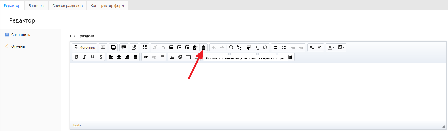 на панели инструментов выберите иконку «Форматирование текущего текста через типограф»;