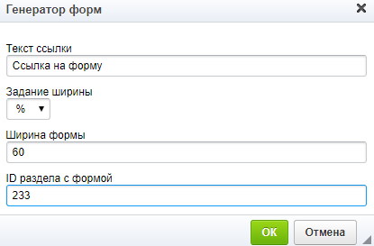 ширина формы - указывается ширина формы в пикселях. По умолчанию 60% от размера экрана.