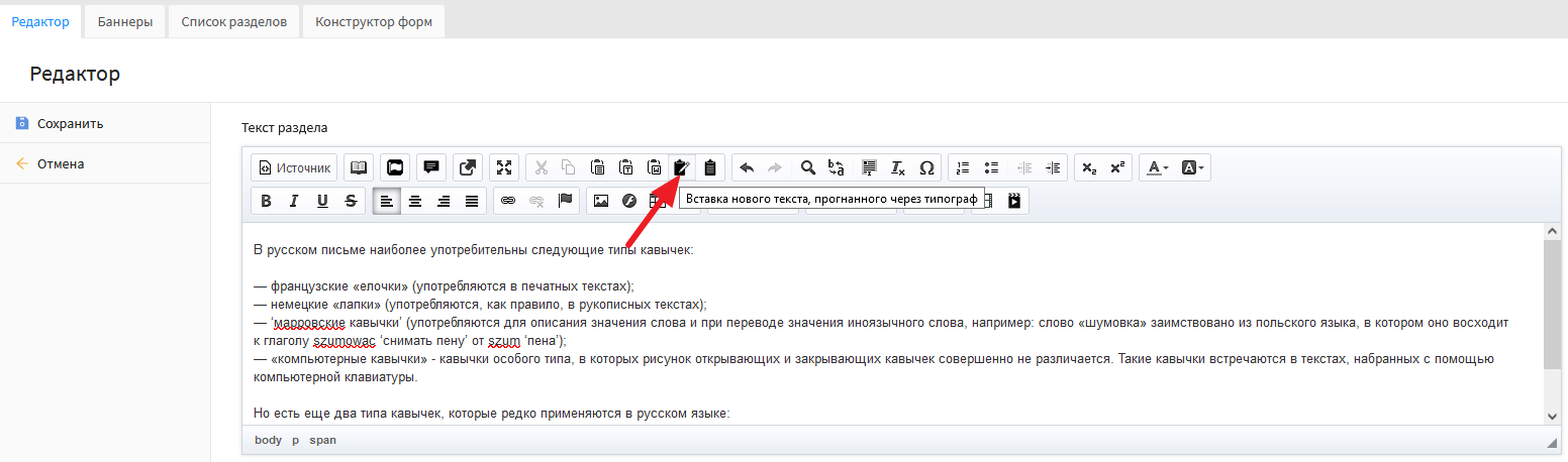 на панели инструментов выберите иконку «Вставка нового текста, прогнанного через типограф»;