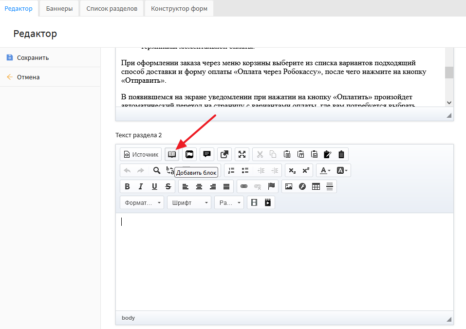 Интерфейс модуля представляет собой кнопку на панели в редакторе раздела: