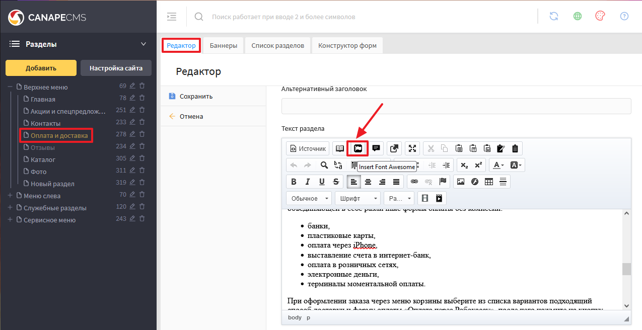 открываем нужный раздел в CMS, переходим на вкладку "Редактор" и в wysiwyg-редакторе нажимаем на иконку "Генератора иконок" . Скриншот .