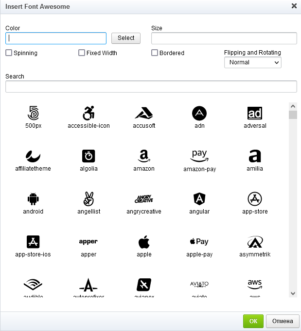 выбираем нужную иконку, настраиваем цвет размер, дополнительные настройки, нажимаем "ОК" .