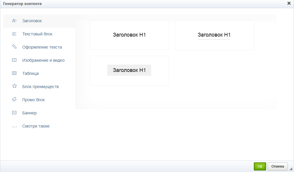 При клике на иконку генератора выводится всплывающее окно, в котором представлены доступные виды блоков: