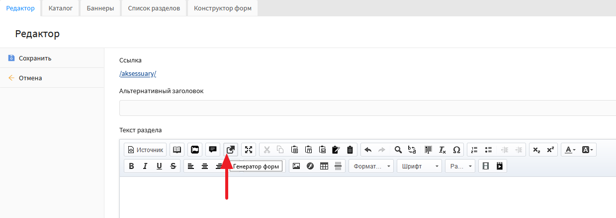 откройте нужный раздел, перейдите на вкладку "Редактор ", установите курсор, там, где должна быть ссылка на форму и нажмите на иконку генератора форм. Скриншот