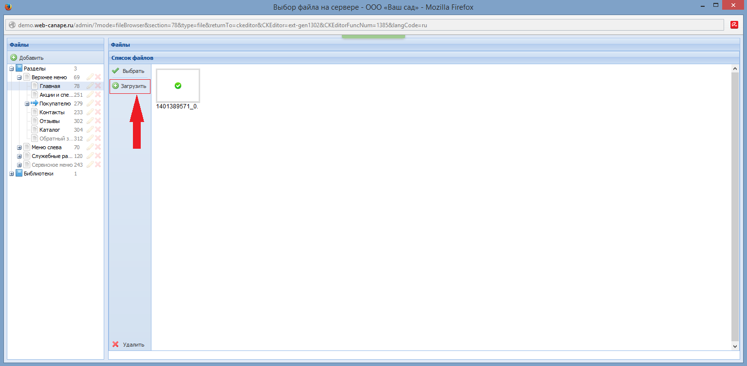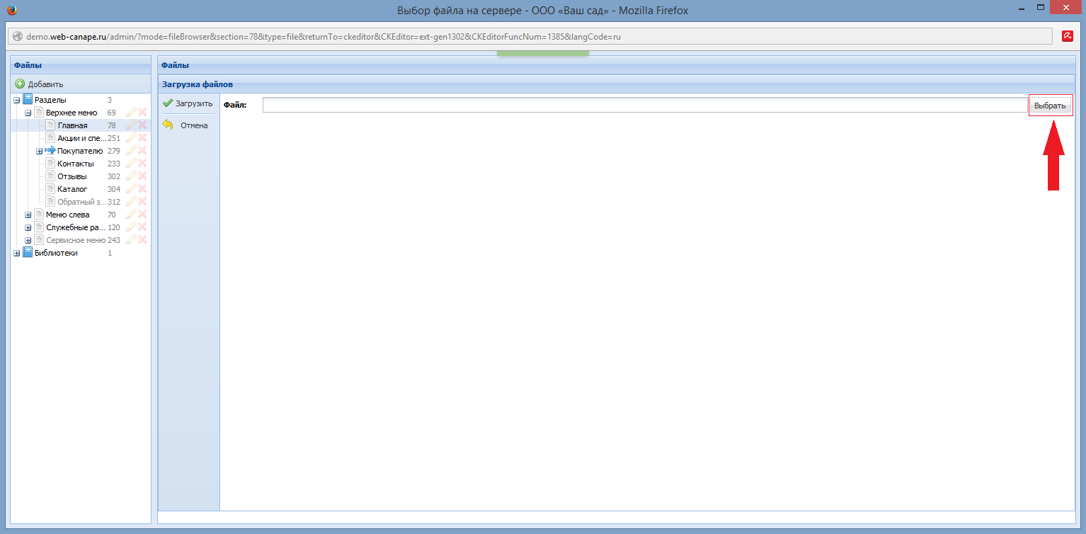В открывшемся окне файлового менеджера в правой его части нажмите кнопку «Загрузить». Скриншот