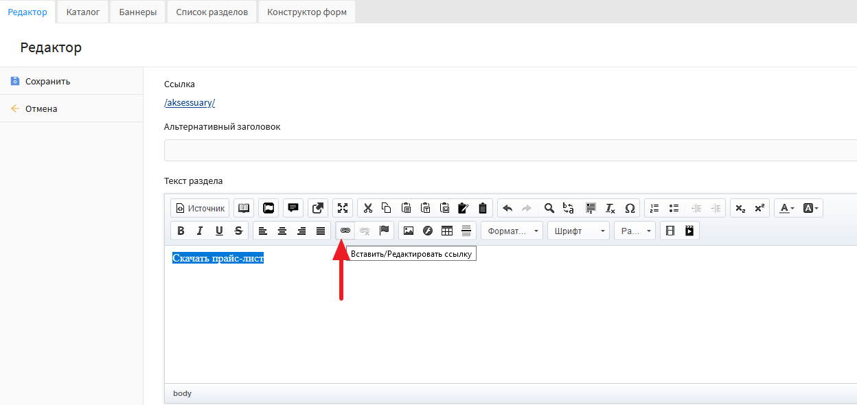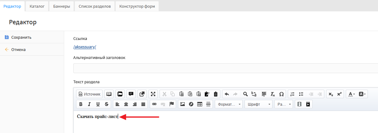 Теперь ссылка на файл добавлена, нажмите кнопку «Сохранить» в редакторе раздела, чтобы сохранить изменения на странице.