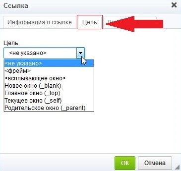 «Главноеокно», «Текущееокно», «Родительскоеокно» — ссылка откроется в текущей вкладке.