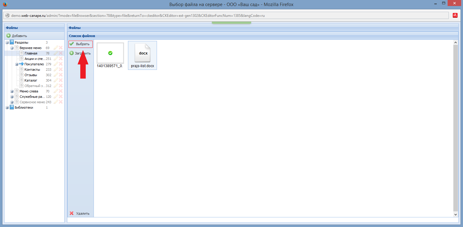 После загрузки документа нужно выделить его и нажать кнопку «Выбрать» или дважды щелкнуть по документу мышкой. Скриншот