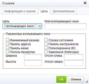 «Всплывающееокно» — при выборе этого параметра появится ряд настроек для окна, которое откроется при клике на ссылку. В полях «Ширина» и «Высота» вы можете установить размеры окна (измеряются в пикселях), а в полях «Отступ слева» и «Отступ сверху» — положение окна на экране. Данный вариант подходит для ссылок на изображения, однако для ссылок на скачивание документов он едва ли имеет смысл, а для перехода на другие ресурсы и вовсе неудобен. Скриншот