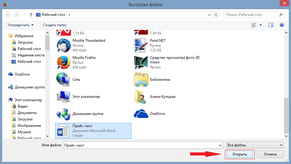 В открывшемся окно «Выгрузка файла» выделите нужный файл и нажмите на кнопку «Открыть». Скриншот