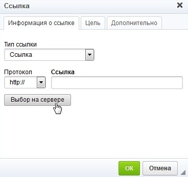 В открывшемся окне «Ссылка» нажмите кнопку «Выбор на сервере». Скриншот