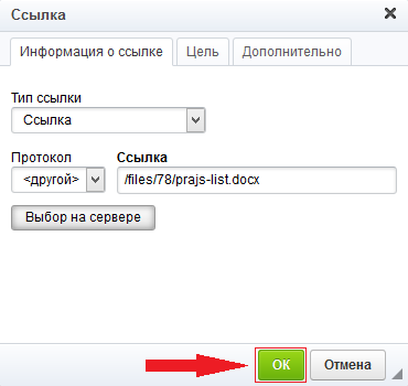 Окно закроется, а в окне «Ссылка» в соответствующем поле отобразится ссылка на документ. Нажмите на «ОК». Скриншот