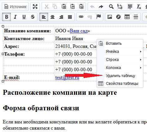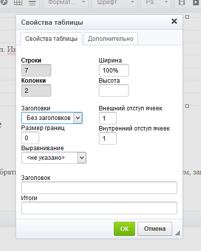 Не рекомендуется переносить таблицы из других источников (Word, страница сайта и т. д.). К этому желательно прибегать только в крайнем случае, когда нет возможности создать новую таблицу и перенести туда текст. Если же избежать этого невозможно, после вставки таблицы необходимо выделить ее мышью и нажать на кнопку удаления форматирования, после чего — выставить в настройках таблицы необходимые параметры. Скриншот