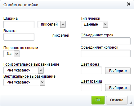 «Объединяет строк» и «Объединяет колонок» аналогичны функциям объединения ячеек. Так, если вы хотите, чтобы в таблице 2х2 в верхнем ряду была одна общая ячейка, вам необходимо выбрать любую из ячеек верхней строки и в ее свойствах в поле «Объединяет колонок» поставить цифру 2 (по количеству объединяемых столбцов).