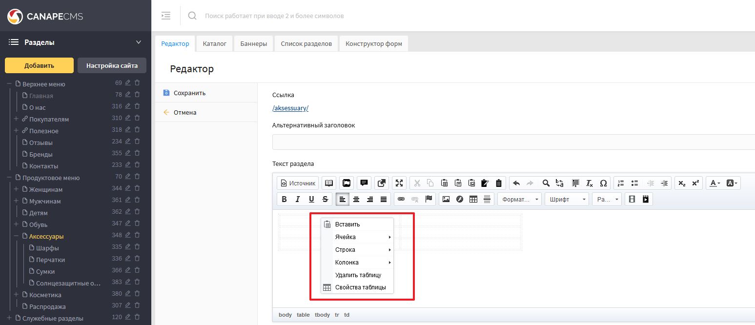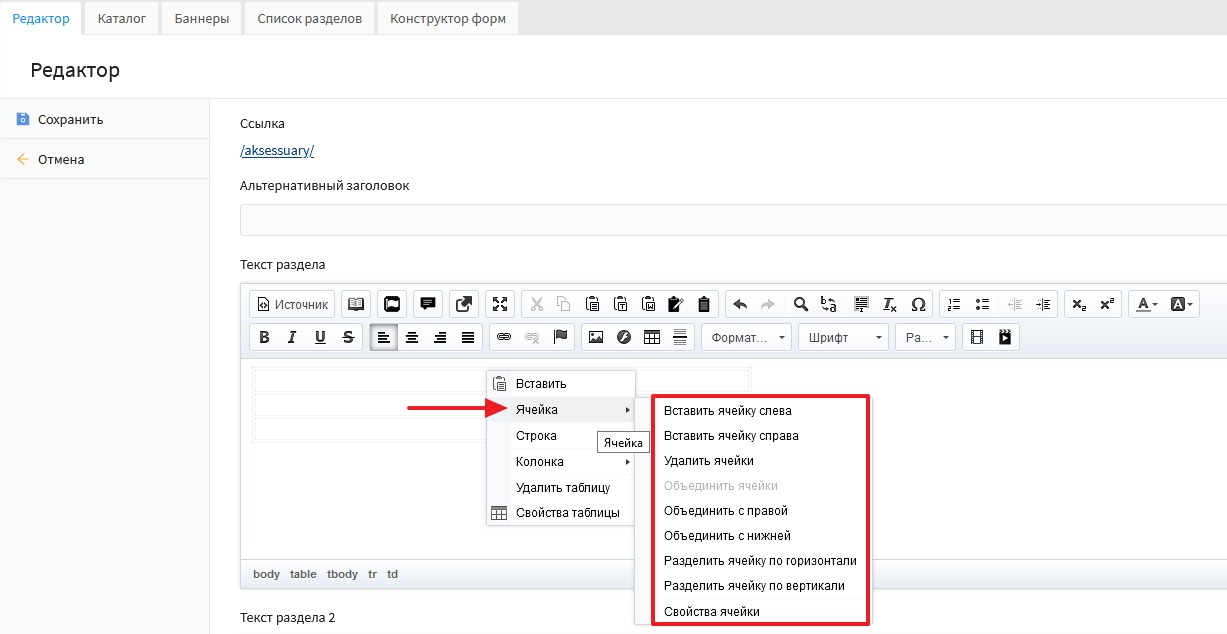 В созданной таблице можно отредактировать отдельно взятую или несколько ячеек. Чтобы увидеть все варианты редактирования ячеек, в вызванном контекстном меню наведите курсор на пункт «Ячейка».