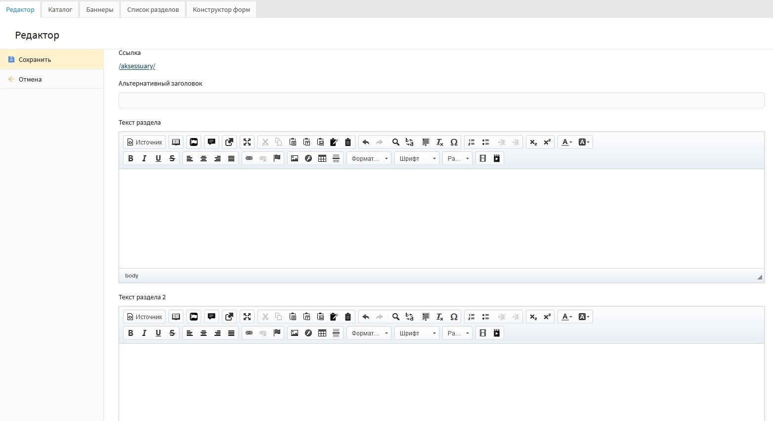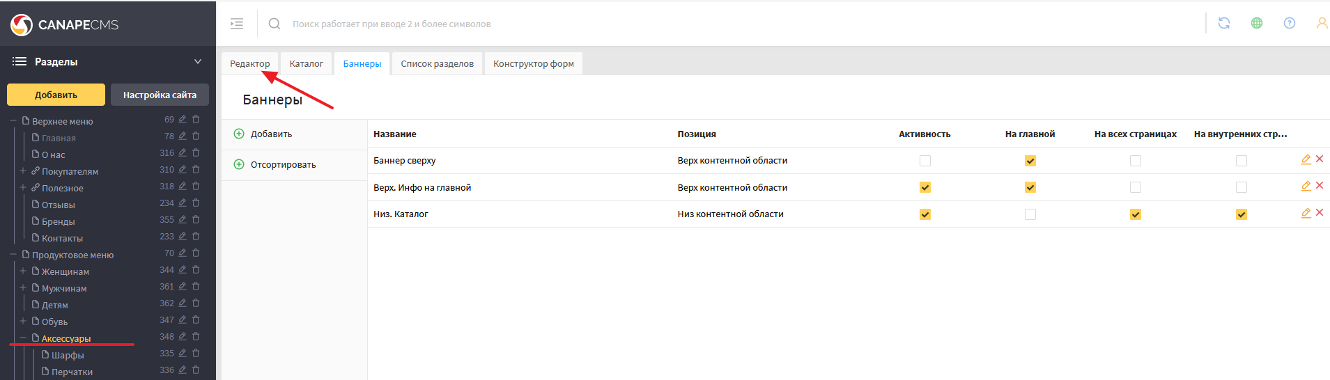 Авторизовавшись в системе управления, в левой части панели из списка разделов сайта выберем страницу «Аксессуары». При переходе к ней вкладка с визуальным редактором откроется автоматически. Если вы к настоящему моменту уже находились в этом разделе, но работали с другим модулем (например, «Баннеры»), просто кликните по вкладке «Редактор», чтобы перейти к работе в нем.
