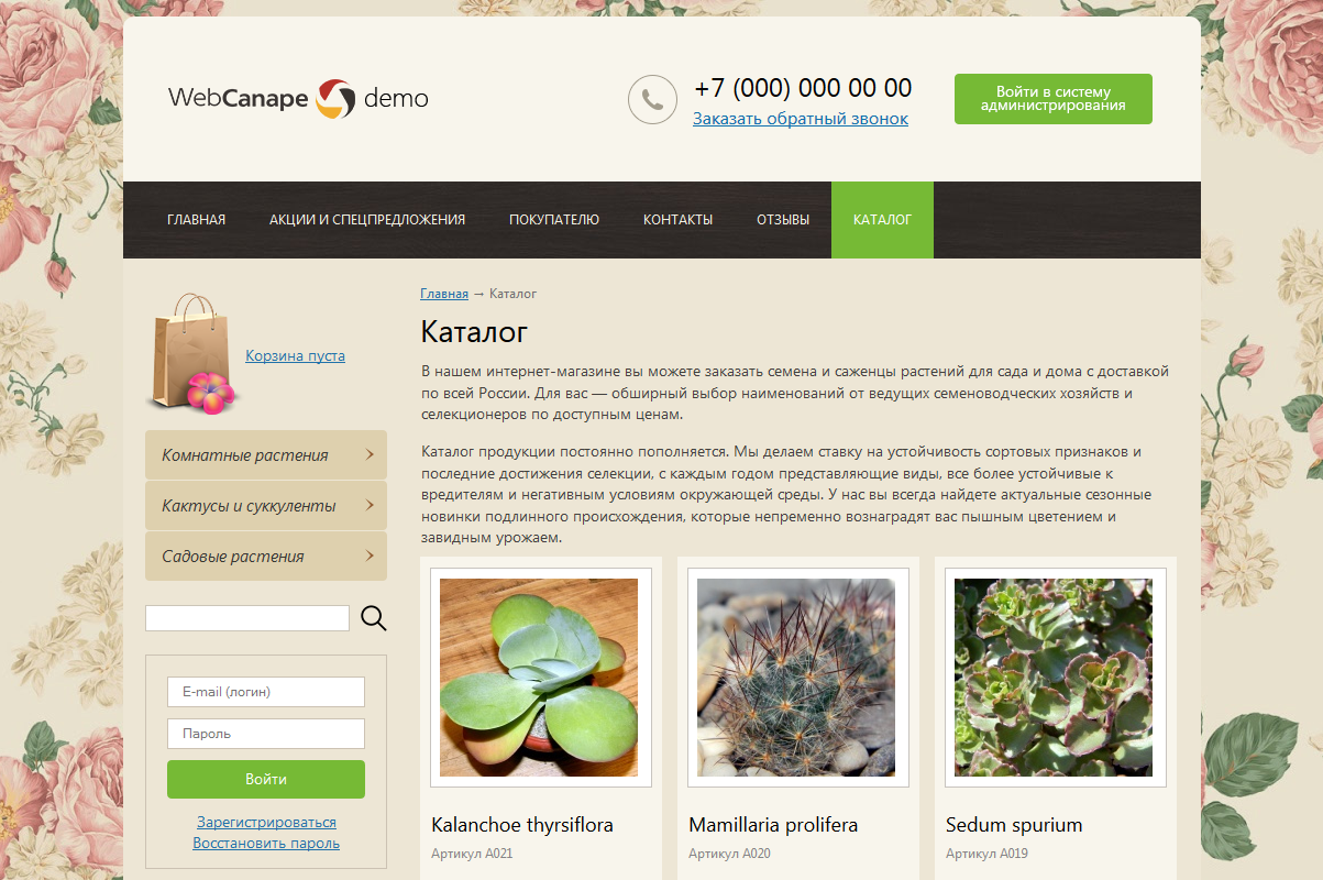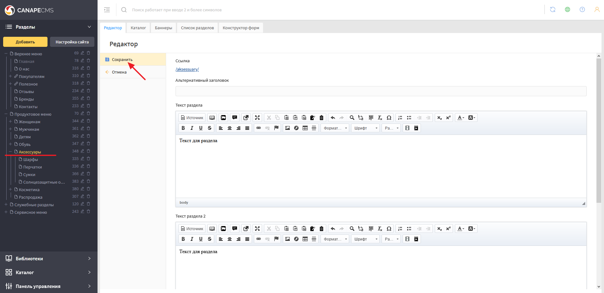 Чтобы добавить текст на страницу сайта, необходимо ввести его в поле визуального редактора, по необходимости оформить и сохранить результат. Рассмотрим это на примере демо-версии http://demo.web-canape.ru/.