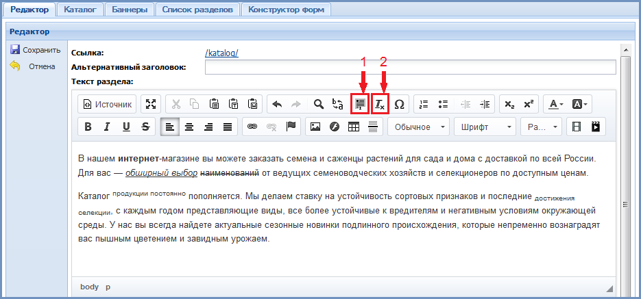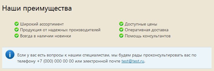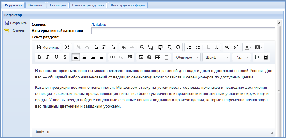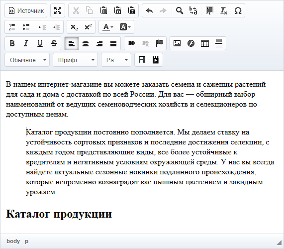 Панель управления сайтом имеет два редактора для вывода контента на страницу. Текст, размещенный в первом редакторе, будет выводиться прямо под заголовком страницы, а добавленный через второй — внизу, после всей информации из остальных модулей (каталога, статей, новостей, отзывов, форм обратной связи). Это позволяет вам самостоятельно решать, в каком порядке будет располагаться контент на той или иной странице вашего сайта.