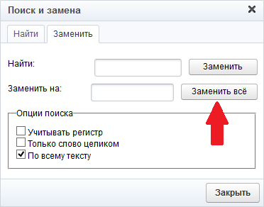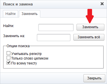 Если вы уверенны в необходимости замены и это слово или часть текста часто встречается на странице, то нажмите «Заменить все». Скриншот