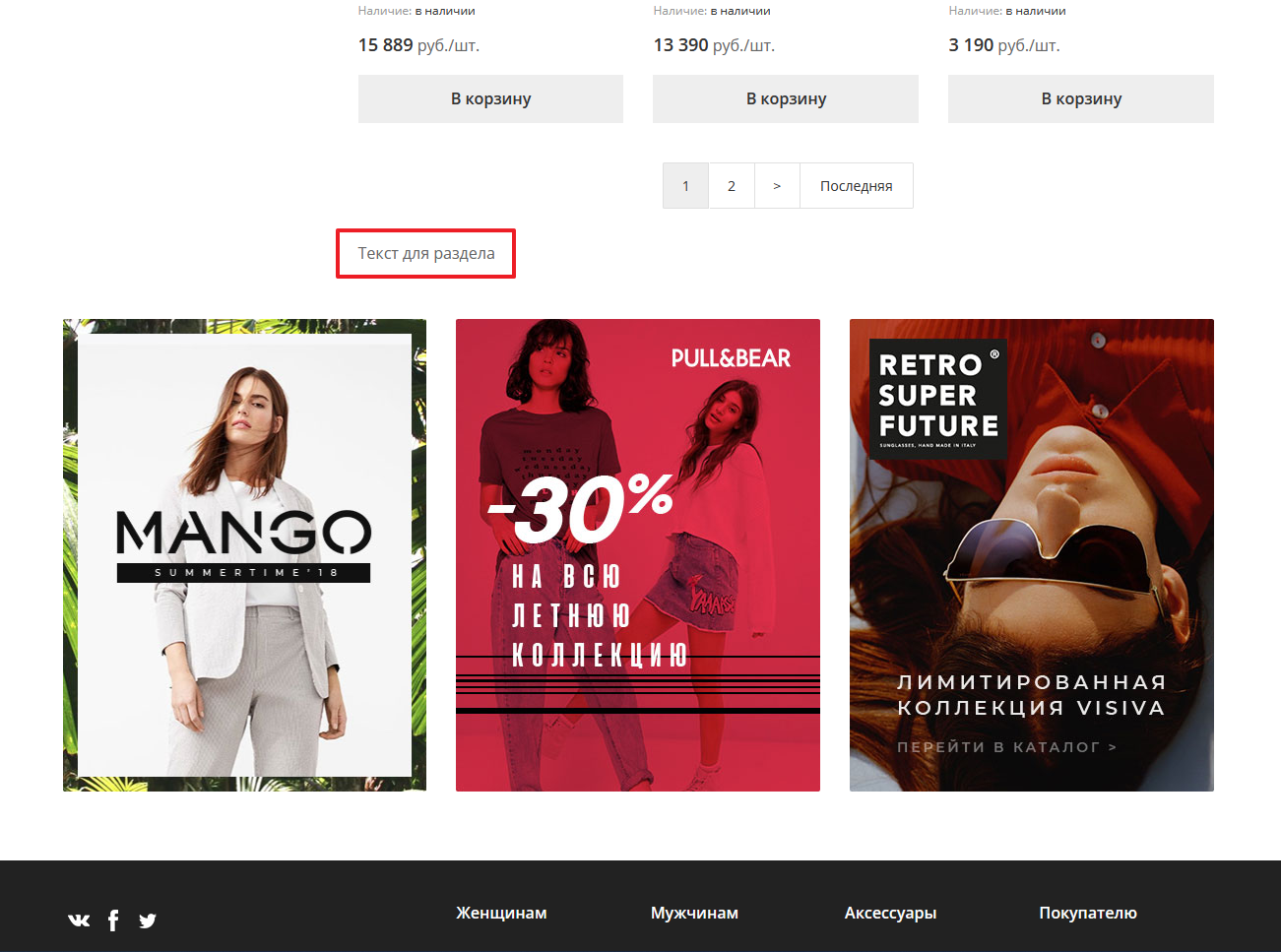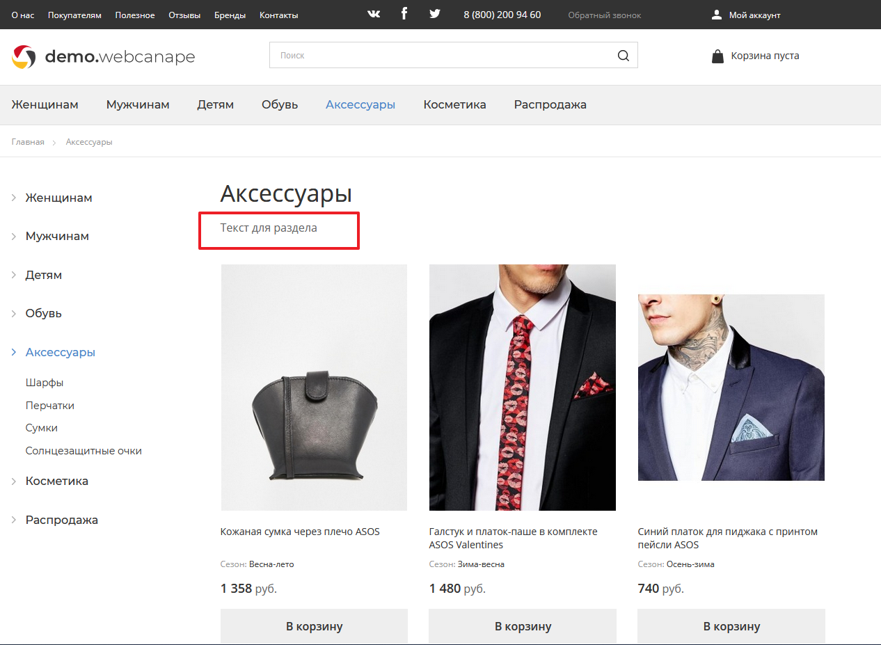 Предположим, что нам необходимо добавить текст на страницу «Аксессуары». В изначальном варианте в этом разделе текста нет — на странице отображены только наименования каталога.