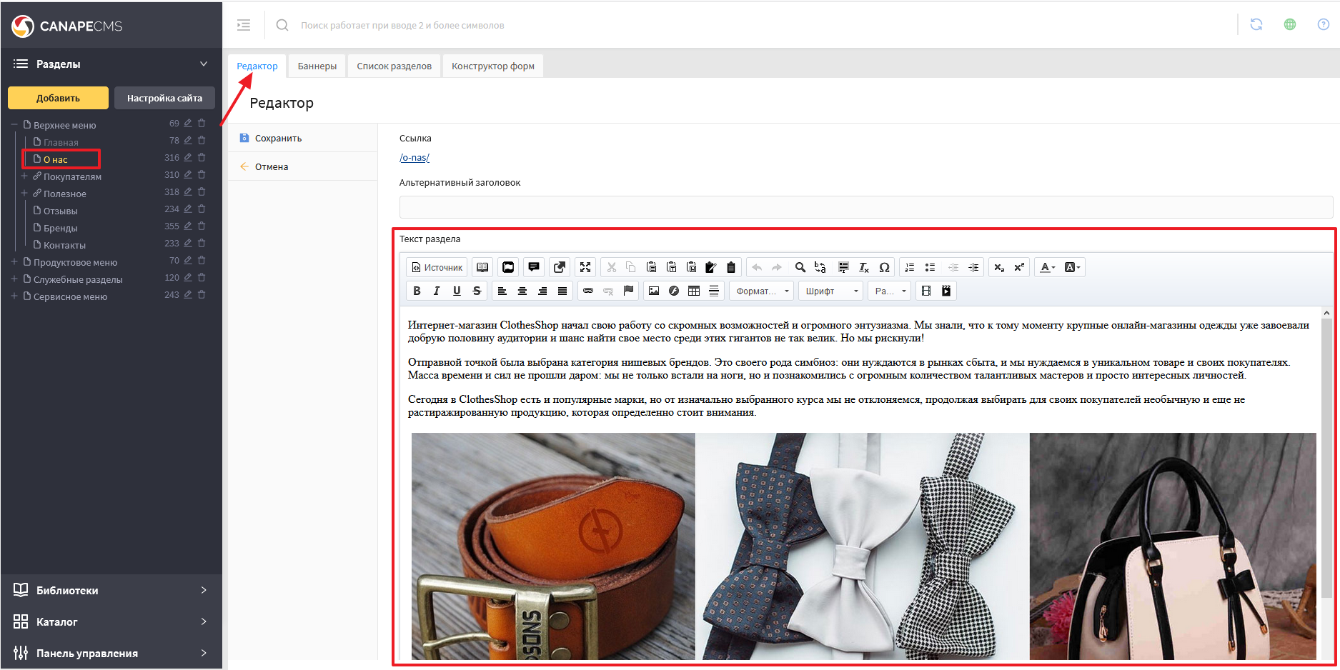 При переходе в какой-либо раздел сайта (для этого необходимо кликнуть по названию нужного раздела в списке слева) вкладка с редактором открывается автоматически как основной модуль для работы со страницей. На рисунке ниже вы можете видеть, что при переходе в раздел «О нас» в редакторе отображается текст с главной страницы сайта.