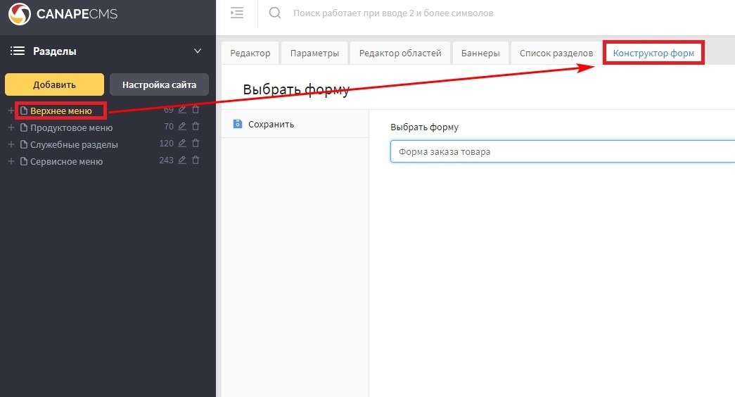- выберите раздел, где должна появиться форма, нажмите на вкладку "Конструктор форм". Скриншот
