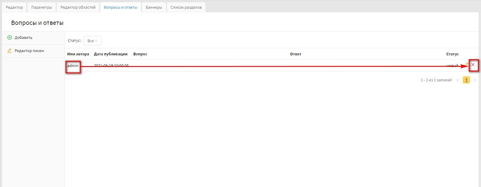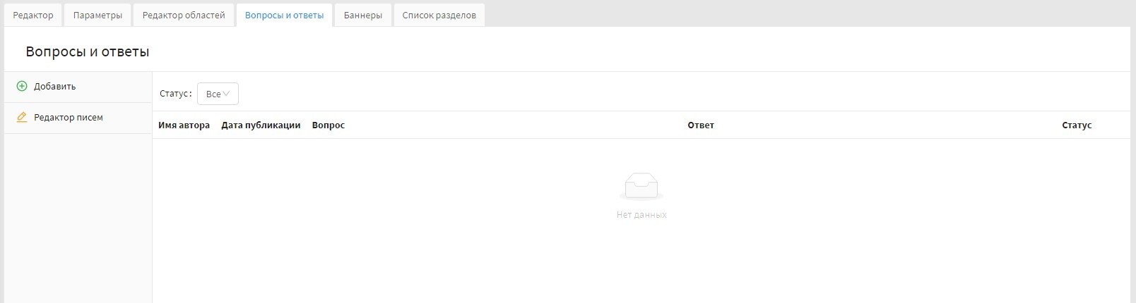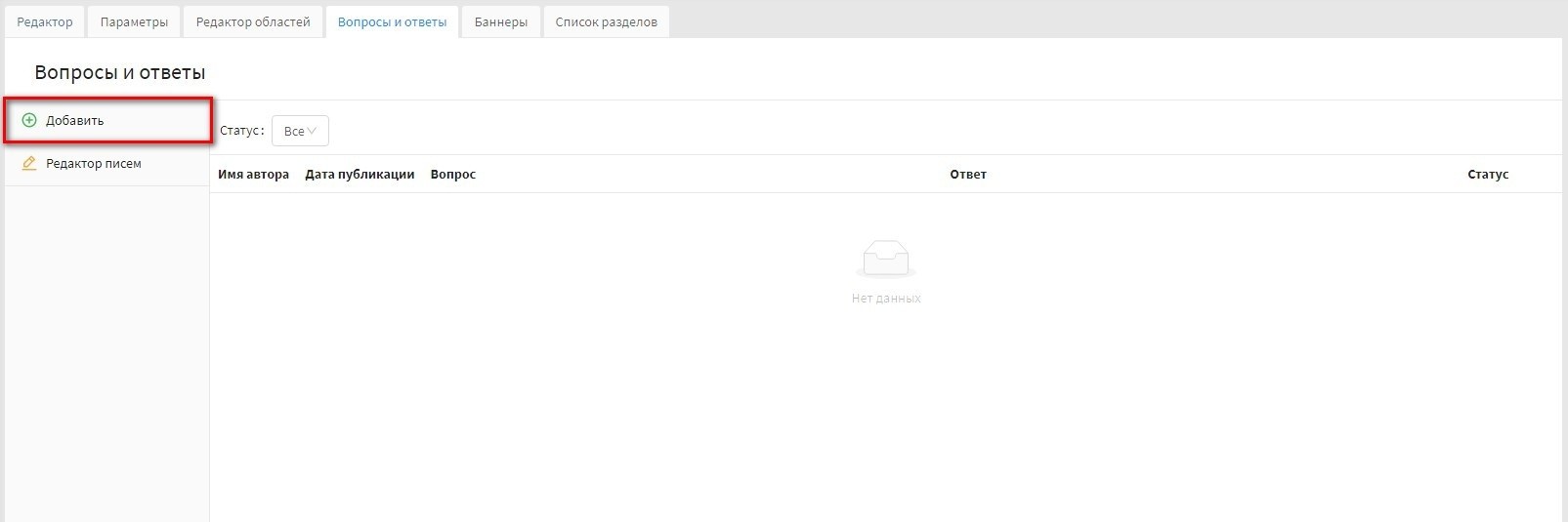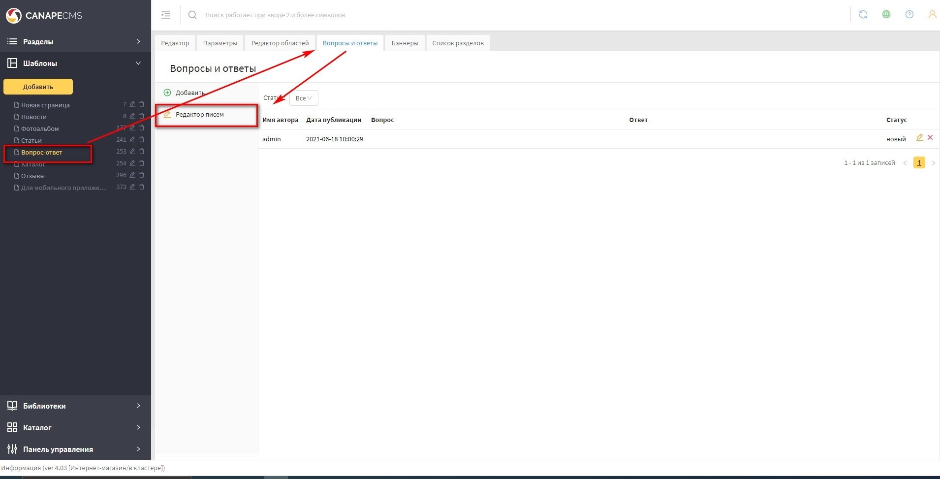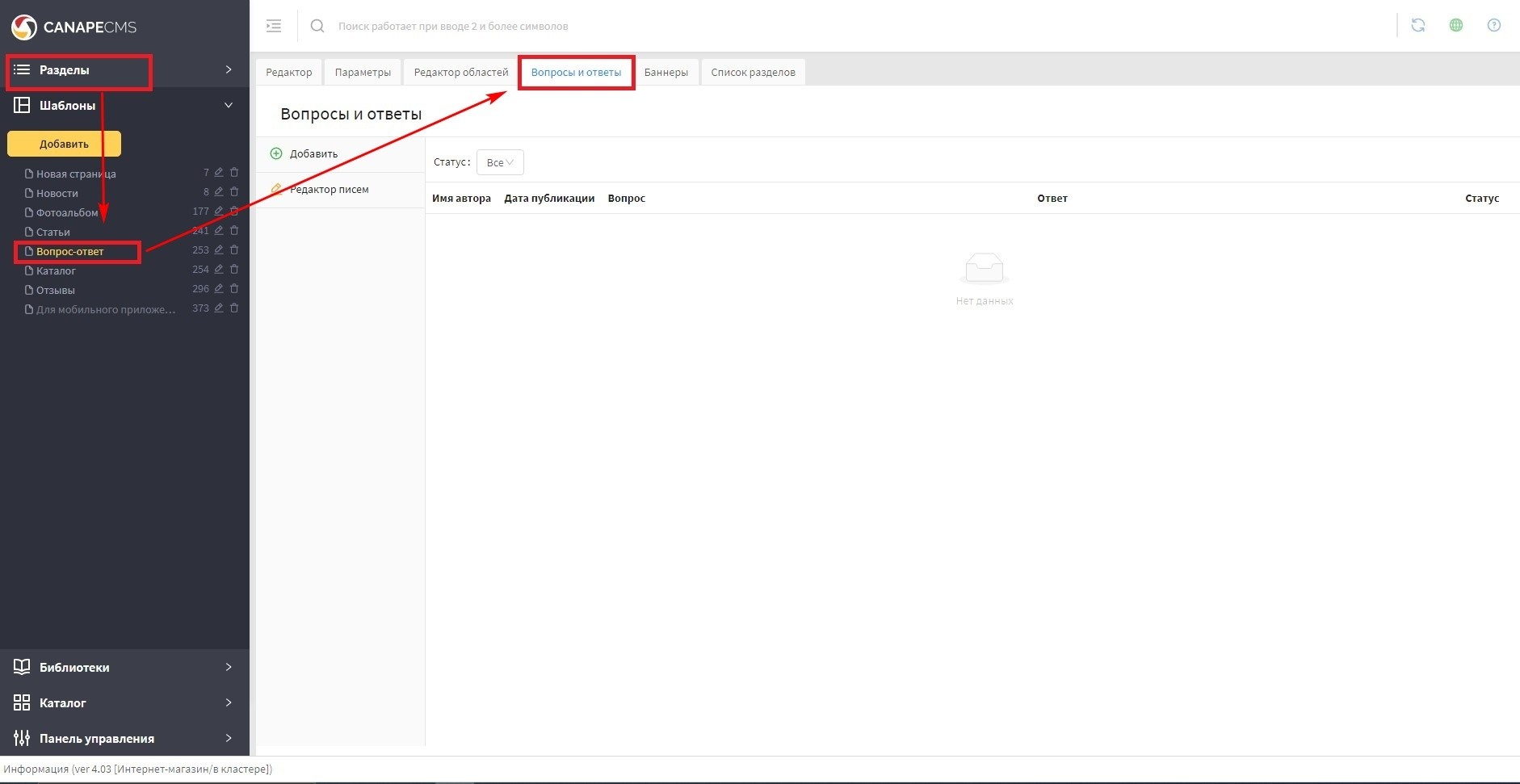 в панели "Разделы" найдите раздел типа "Вопрос-ответ", нажмите на него и в правой части откройте панель "Вопросы и ответы". Скриншот