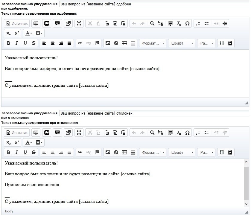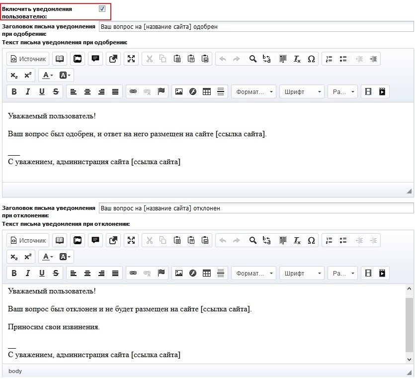 Данный функционал подключается с помощью параметра "Включить уведомления пользователю". Скриншот. В случае, если функционал включен, то при одобрении или отклонении вопроса пользователю, оставившего его, приходит уведомление с текстом.