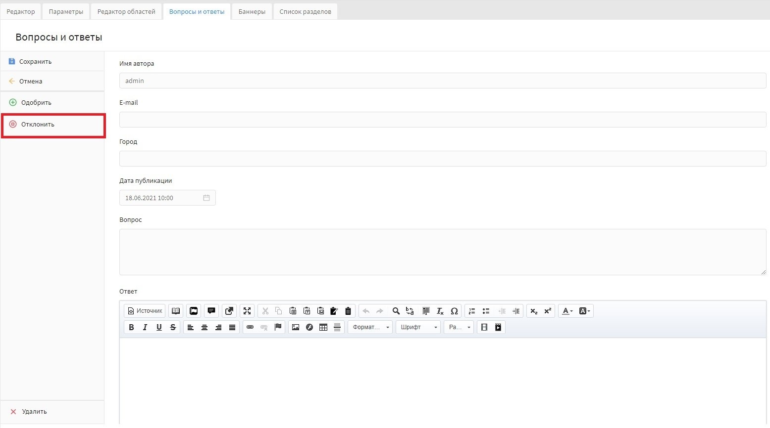 кнопка "Отклонить" - при нажатии для вопроса выставляется статус "Отклонен" и он не выводится в разделе.