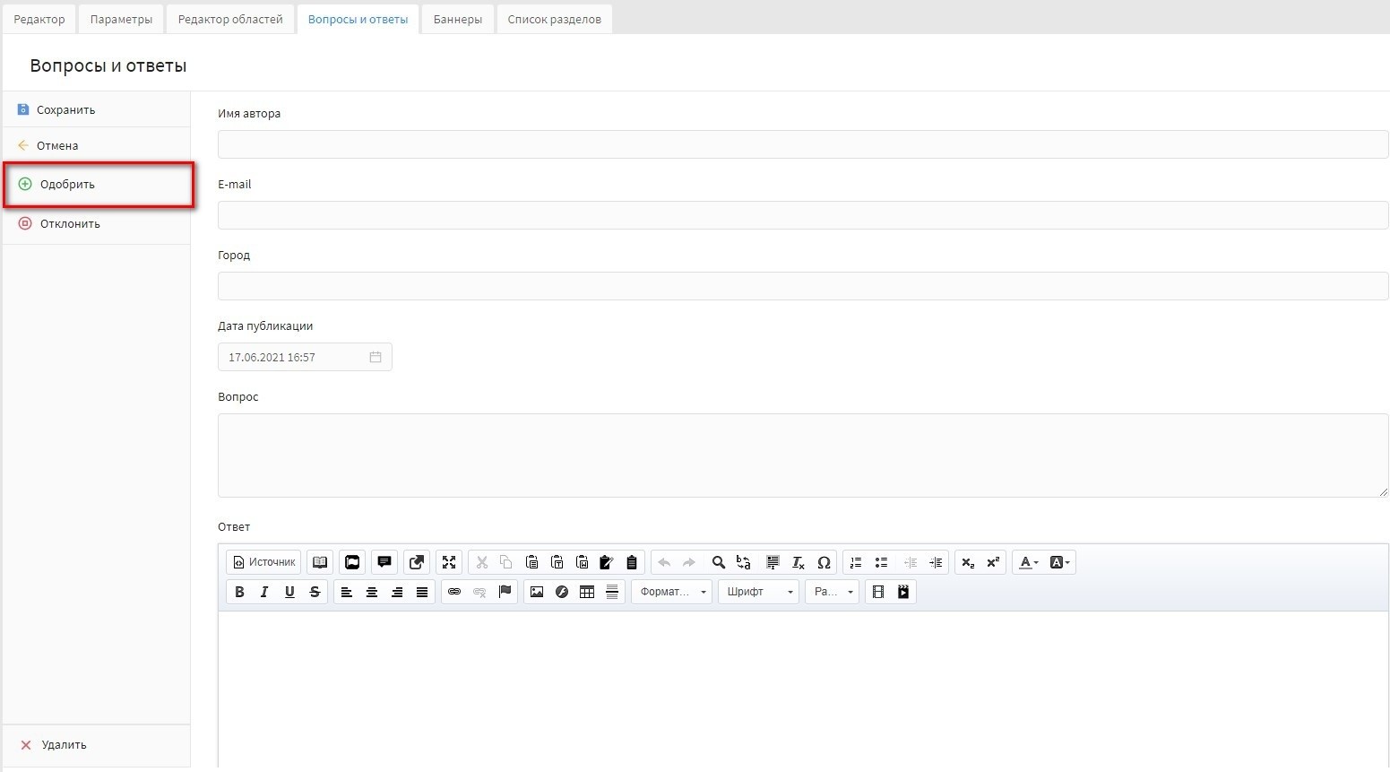 в открывшемся интерфейсе в поле "Ответ" добавьте ответ на вопрос и нажмите на кнопку "Одобрить". Скриншот